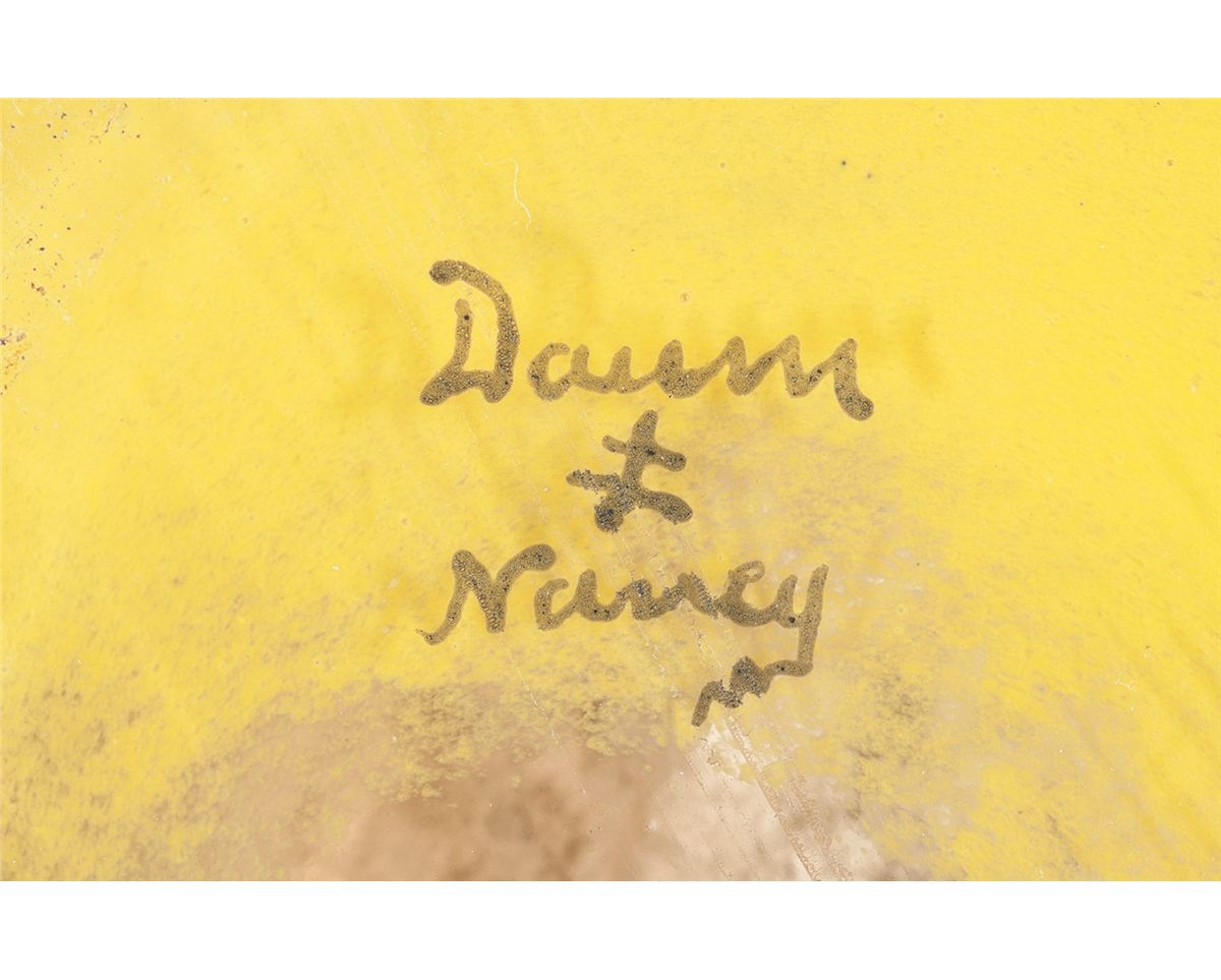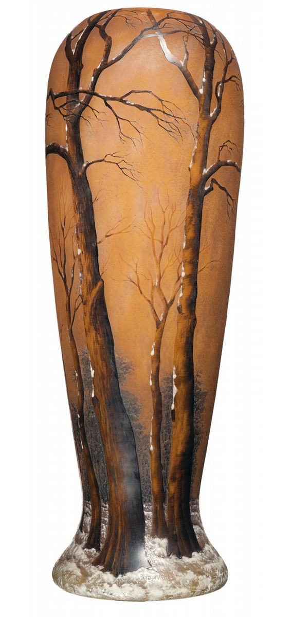 The Daum glassmaking company, also known as Daum Brothers, was originally established in the city of Nancy, France as the Verrerie Sainte Catherine, in which Jean Daum, a notary and industrialist by trade, was a financier. When the firm hit a nearly fatal slump Daum assumed direct control and brought it back into solvency. Under the tenure of his sons Auguste and Andre it would grow to be a leader in the field of French art glass and the Art Nouveau movement. Measuring 16 inches tall and 5 inches across the base, the exterior is adorned with a scene of a forest in wintertime. Using a combination of techniques associated with Daum, the core material is a light brown glass with yellow streaks which was overlaid with mixed darker brown glass. It was then etched through in three layers. The top unetched layer forming the foreground trees, the second layer the backgrounud trees, and then the deepest etching forming the sky and most distant background to which was added white enameled snow using a ringed effect around the base to further emphasize the illusion of depth created by the etching. The underside of the base is marked with the address/signature "Daum/(Lorraine Cross)/Nancy".