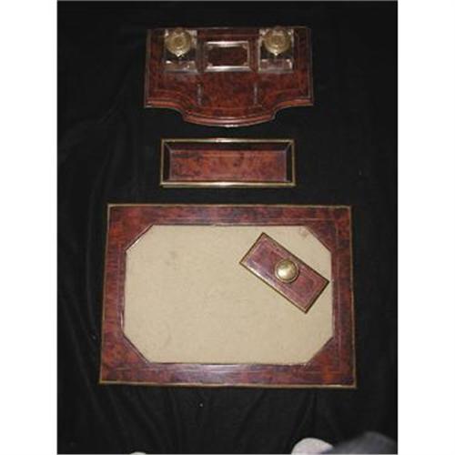 Magnificent C.1820 burl 4 piece Italian desk set. Al. four parts are walnut burl with ebony inlay and encompassed in thick brass. Set includes a desk pad which is extra thick for protection,space for new blotter paper to be added under the burl edges. The blotter with brass handle,tray for clips etc. and ink well with two crystal jars and solid brass lids with the wreath design. Stands on three solid brass feet. Slot for pen on two raised brass stands and a third compartment for business card surrounded by silver. One tiny worn spot on ink blotter as seen in photo,otherwise this exceptional set in excellent condition,new blotter pads available. Handsome addition to any desk. Desk pad measures 18.5L X 13.5W X 1H. Blotter 6L X 3W X 3H. Tray 3.5W X 10.5L X 1.5H. Inkwell 13.5L X 8.5W X 1.5H.