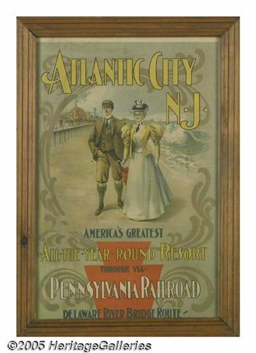 <B>Magnificent Early Cardboard Advertising Sign for Altantic City and the Pennsylvania Railroad</B></I> This colorful sign pictures an 1890s couple strolling on the beach with the famed Boardwalk in the background. We have never seen this item before, and it should appeal to a wide range of collectors, including railroad enthusiasts. A couple of minor light corner creases are noted for accuracy, as is very slight general "aging," but certainly no defects of consequence, and overall excellent shape. 16.5" x 23" in vintage frame. Lot:252