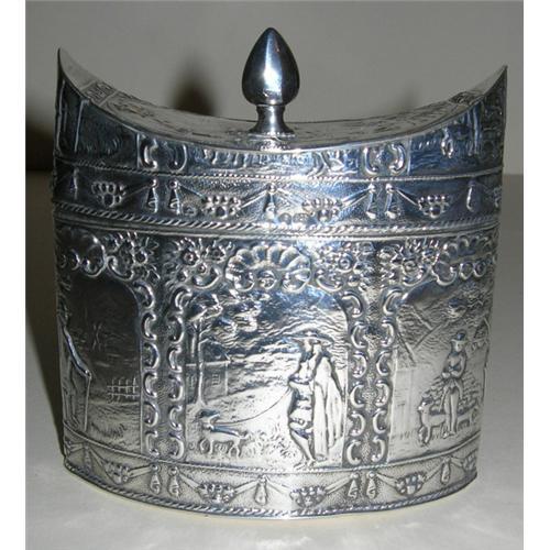 A beautiful repousse silver tea caddy by the highly collectible Berthold Muller with import English hallmarks for London 1904. The original German hallmarks can also be seen.