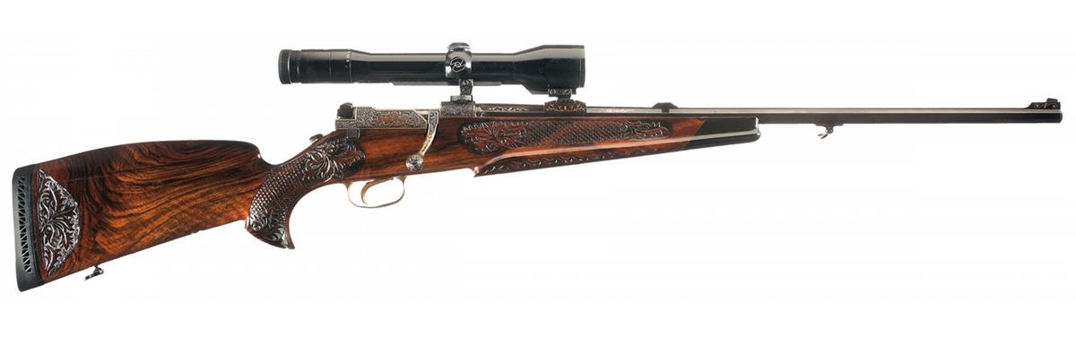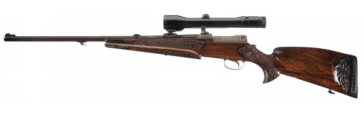 Manufactured in 1984. The receiver is very nicely engraved with a Cap Buffalo scene flanked by a floral vine design on each side. The remainder of the receiver has the same floral vine design with the skull of a Cape Buffalo on the top rear. The receiver has gold wire inlaid borders. The top of the receiver on the right side is marked with the Mauser banner followed by Mod. 66 S" and "MAUSER WERKE Oberndorf GmbH" on the top left side. The octagon barrel has a solid rib with a integral ramped front blade sight and folding leaf rear sight. The muzzle and breech end have gold inlaid wire bands. There is a decoration gold inlaid design on the sights of the front sight ramp, sides of the front scope base and upper rear barrel flats. The left rear of the barrel is marked with a "eagle/N" proof followed by "IE" Ulm antler proof. There is a sling swivel mounted on the underside of the barrel. The bolt handle and trigger guard have the same floral vine design, with gold inlaid wire border and accents on the bolt handle. The rifle is equipped with a Zeiss 1.5-6x42 scope. The rifle is mounted with a very nicely figured one-piece walnut pistol grip stock with a horn forend and fish scale and floral leaf caving on the forearm and wrist and floral leaf designs on each side at the butt. The stock has a cheek piece, three round cartridge compartment, sling swivel and black vented recoil pad.