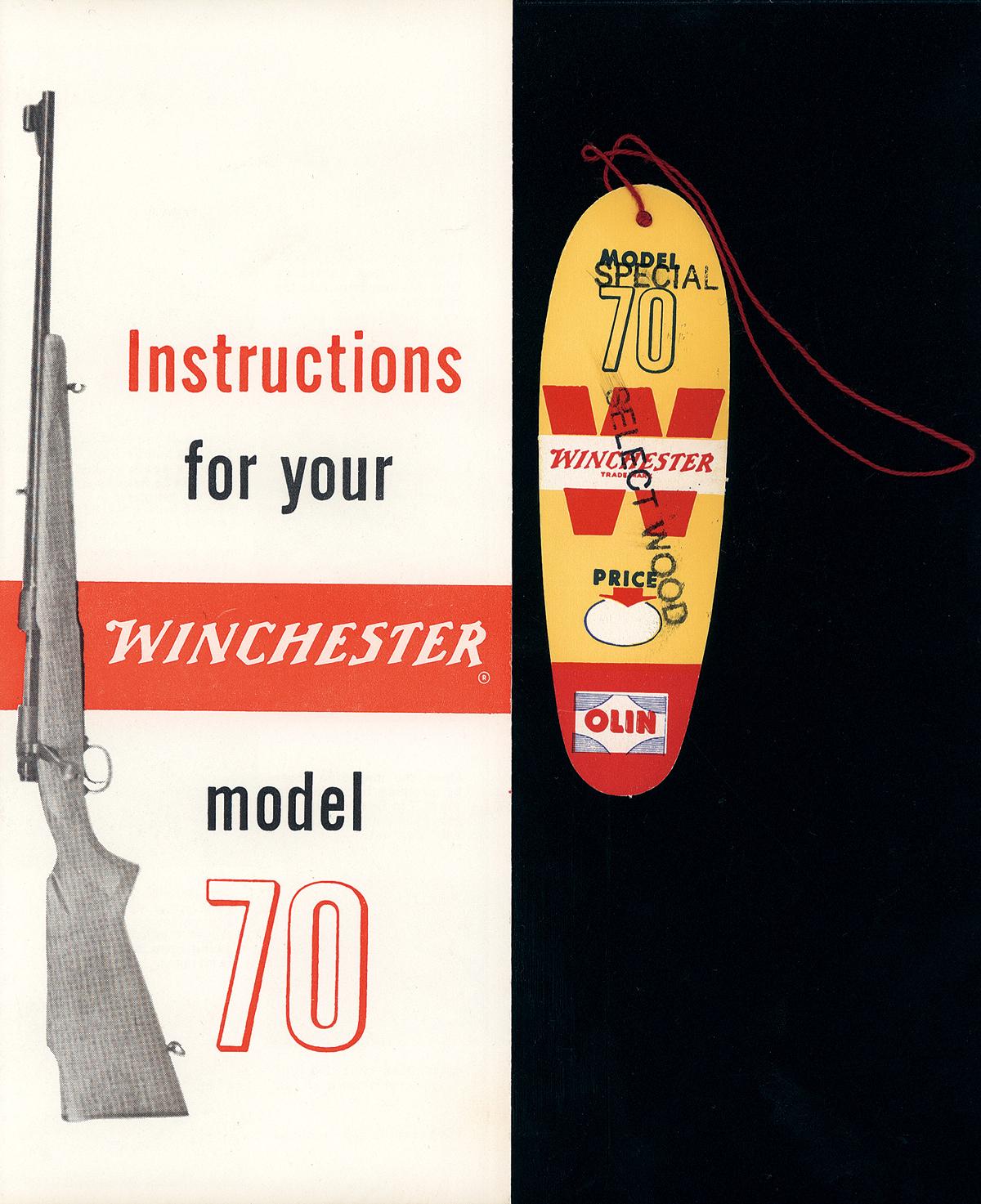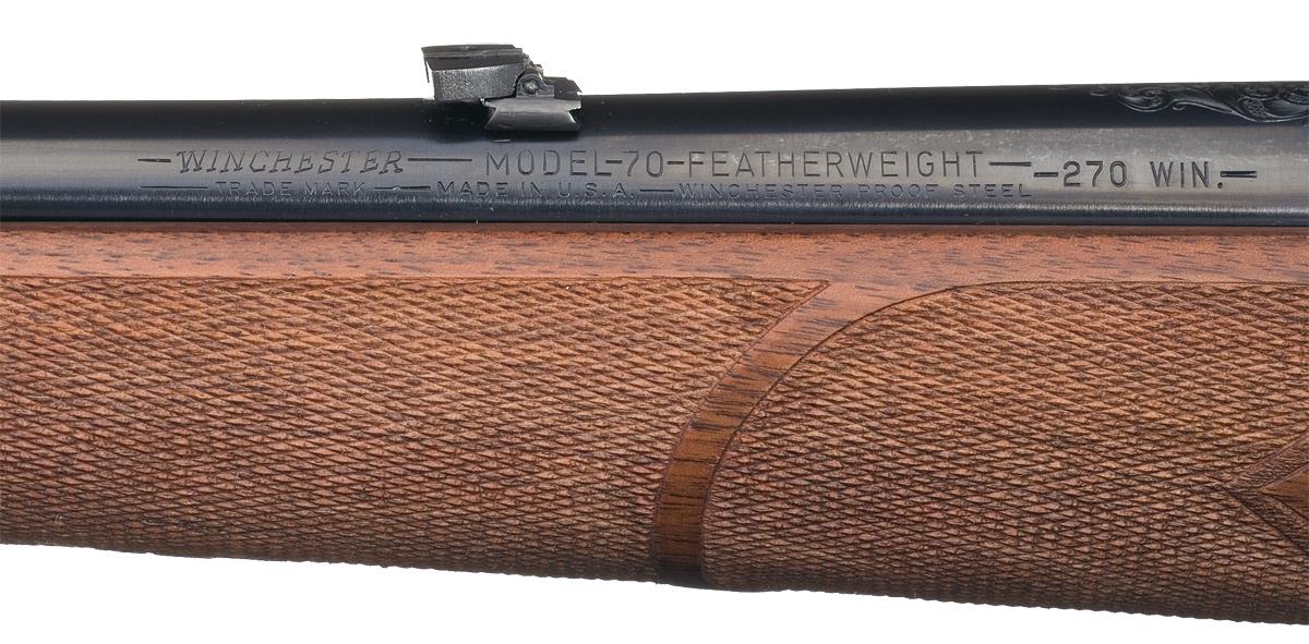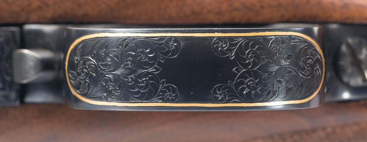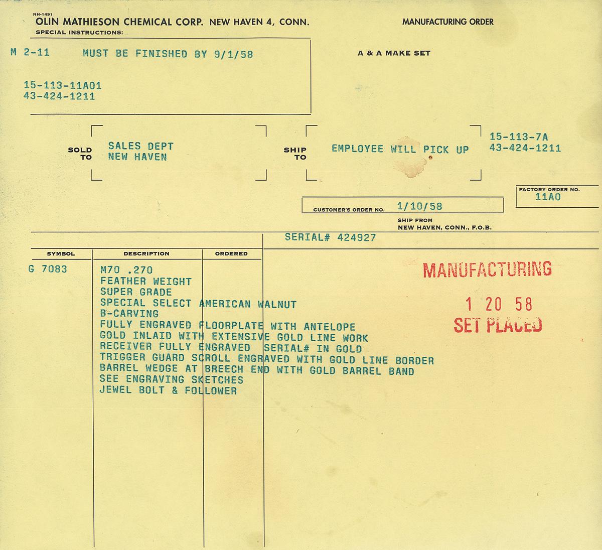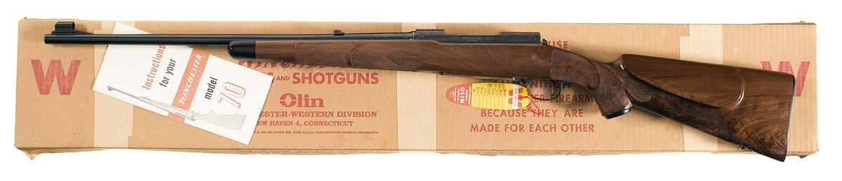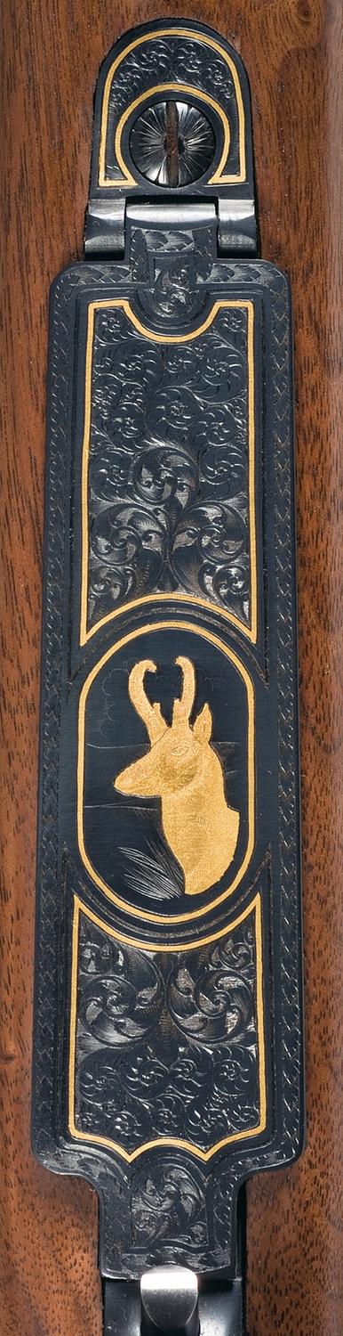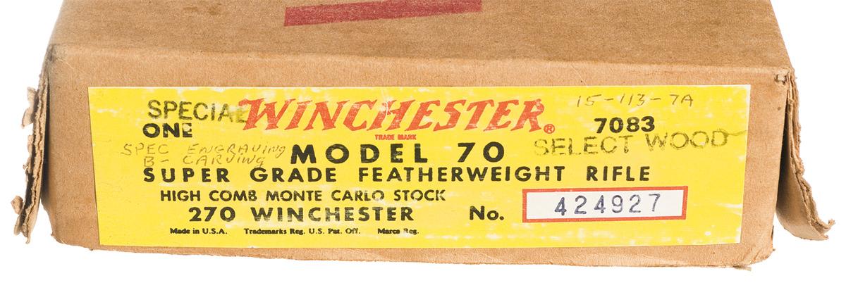 Manufactured in 1958, this special order, Super Grade Model 70 features floral scroll and fine scroll engraving on the receiver, floor plate, trigger guard and a 2 inch wedge on the breech end of the barrel. There is a gold inlaid band around the breech, gold inlaid wire bordering on the floor plate, hinge and trigger guard. In addition the floor plate has a gold inlaid antelope head bordered with a gold oval. The serial number on the right side of the receiver is gold inlaid. The barrel and receiver markings are standard and the barrel is equipped with a hooded ramp front sight and single folding leaf rear sight. Jeweled bolt and follower. The rifle is mounted with a special select American walnut stock with hand checkering and B-carving. The stock is fitted with an ebony forend, checkered steel buttplate and sling swivel bases. The rifle is accompanied by the original invoice. The special instructions read "MUST BE FINISHED BY 9/1/58. The details of work to be done read "M70 .270 Feather Weight Super Grade Special Select American Walnut B-carving fully engraved floor plate with antelope gold inlaid with extensive gold line work receiver fully engraved serial # in gold trigger guard scroll engraved with gold line border barrel wedge at breech end with gold band see engraving sketches jewel bolt & follower". The individual ordering this rifle known exactly what he wanted when he ordered it. The rifle is complete with the original box numbered to the gun containing the original partitions and wax paper, manual and hanging tag. The end label on the box and the hanging tag are both ink stamped "SPECIAL SELECT WOOD". The end label is also hand marked "SPEC ENGRAVING / B - CARVING".