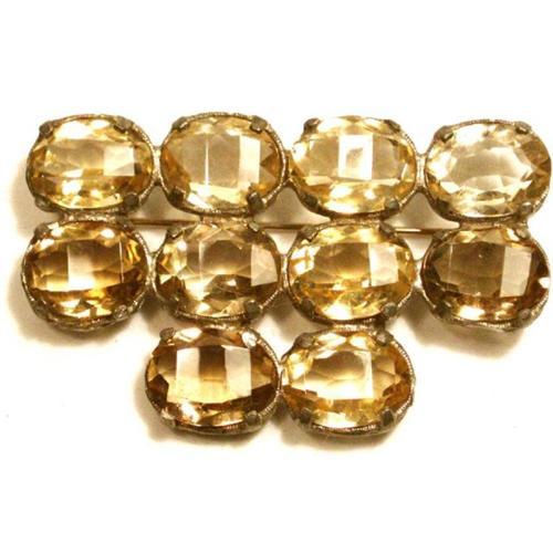 Just check out the sheer SIZE of this brooch and you will be amazed ! IT is heavy and has open back settings so these wonderfully faceted stones. The cuts are really beautiful with a dome shape on the top. The brooch is over 2 ½" wide and the color is the palest yellow. Lots of glitz and sparkle come off this one!!.