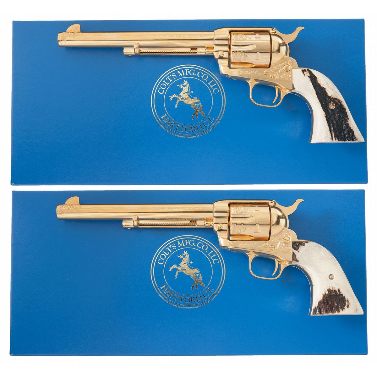 Magnificent Historic Cased "C. Anderson" Signed, Engraved and Gold Plated Pair of Two Consecutively Serial Numbered Colt Single Action Army Revolvers with Factory Letter, Gun Belt and Original Boxes Specially Produced to Benefit The Happy Trails Children' s Foundation Created by Roy Rogers -A) Engraved and Gold Plated Colt Custom Shop Single Action Army Revolver with Stag Grips