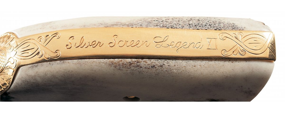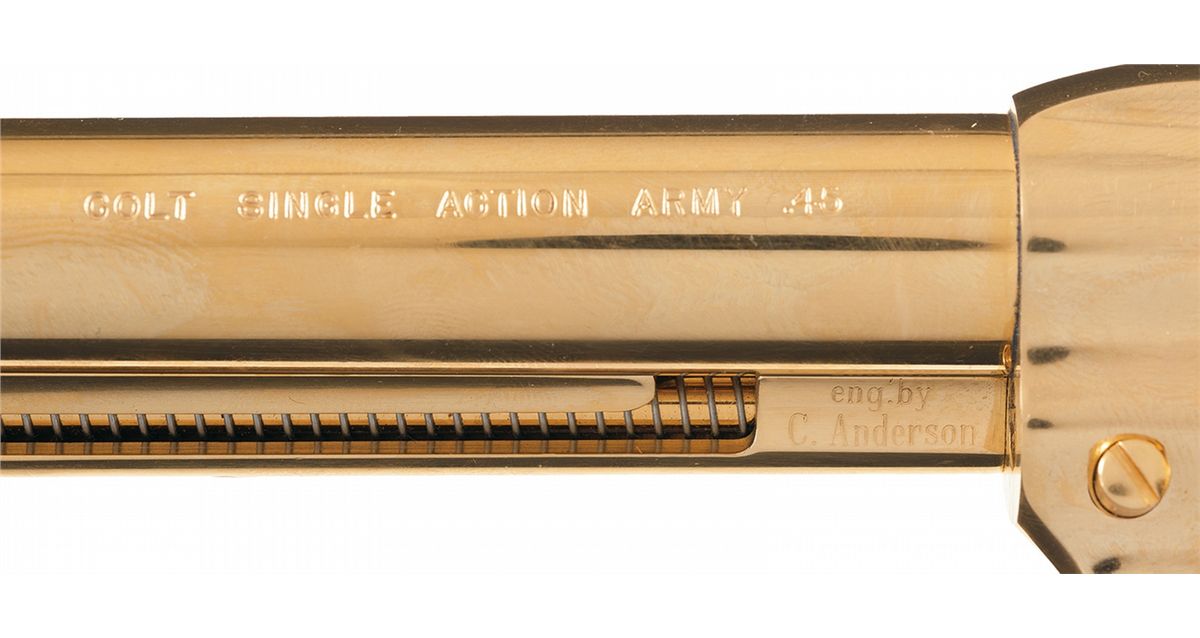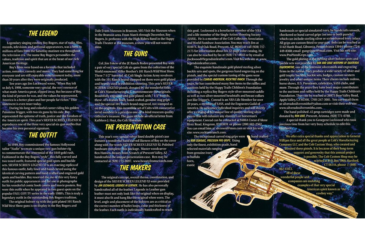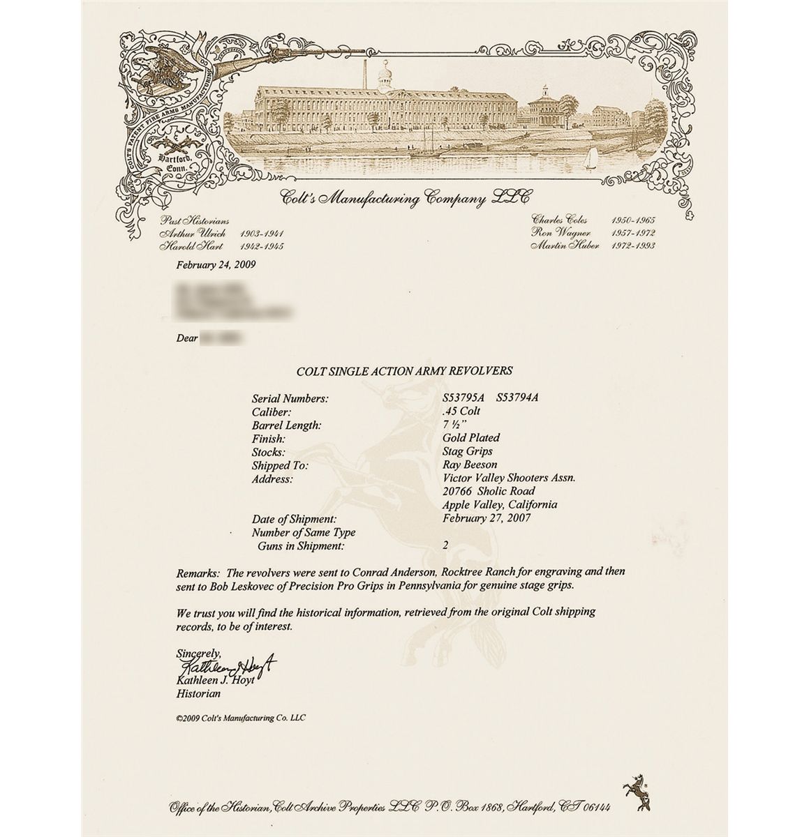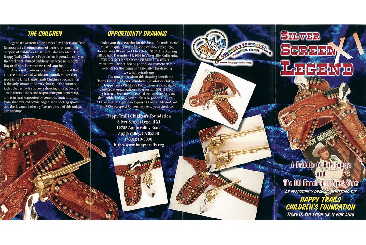 These revolvers were ordered by the Happy Trails Children's Foundation for the 2008 raffle drawing. There are flourishes of floral scroll engraving between the cylinder flutes, on the sides of the frame, on the loading gate, on the ejector rod housing and on the muzzle end of the barrel on either side of the front sight. The front sight is engraved with a feather pattern. The right side of the barrel is engraved "101RANCH" in a banner. The ejector rod housing is engraved "HAPPY TRAILS" in a banner. The loading gate is engraved with the serpentine Colt logo among the floral scroll. The right side of the frame is engraved with Roy Rogers jumping through a lasso. The back strap has some decorative engraving with "Silver Screen Legend XI" in script lettering. The ejector rod housing is signed "C. Anderson" on the bottom near the cylinder pin. Fitted with a set of genuine stag grips. The factory letter covers both revolvers and confirms that they are .45 Colt, 7 1/2" barrel, gold plated, stag grips, that they were shipped to Ray Beeson of Victor Valley Shooters Association, 20766 Sholic Road, Apple Valley, California on February 27th, 2007. The factory letter has a remarks section of "The revolvers were sent to Conrad Anderson, Rocktree Ranch for engraving and then sent to Bob Leskovec of Precision Pro Grips in Pennsylvania for genuine stage grips.". Comes with a hardwood display case that has a hand engraved likeness of Roy Rogers on the lid by Ben Hansen, of Beauty From Scratch, a tooled leather gun belt by Jim Lockwood, of Legends in Leather, having gold plated sterling silver hardware with the buckle, keeper and end cap signed or stamped by Conrad Anderson. Approximately 35 .45 Long Colt dummy cartridges, a blue Custom Shop box and the original box numbered to the gun. There is also a brochure that features beautiful photography of the revolvers and gun belt, outlines who performed the work on the different items in this lot and explains what the Happy Trails Children's Foundation does.
