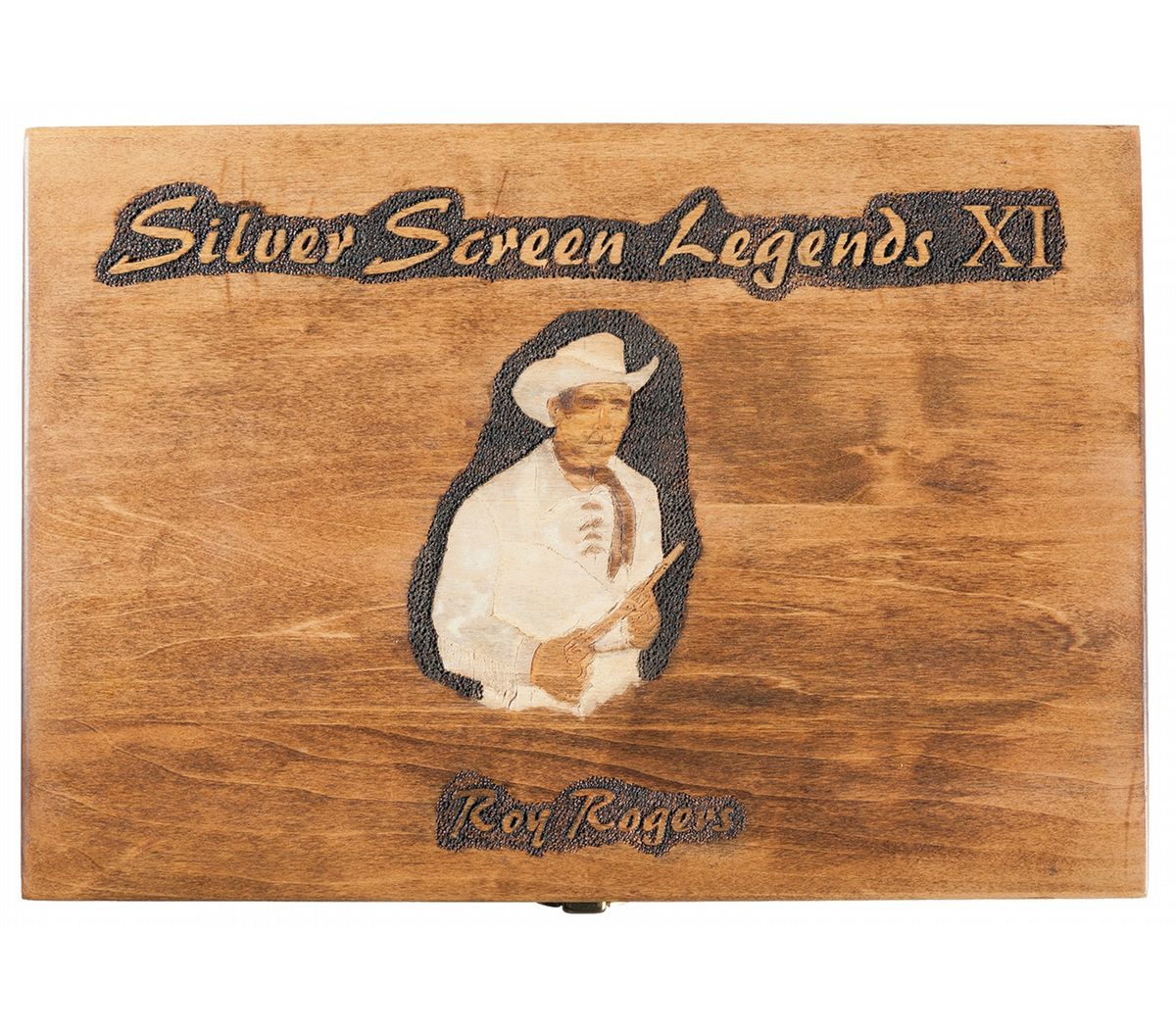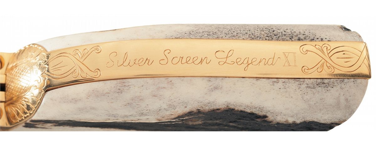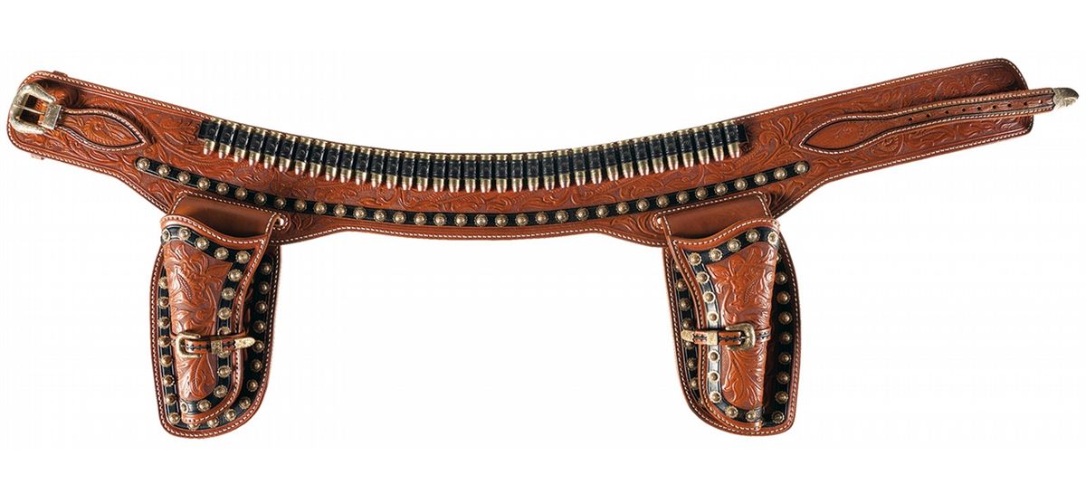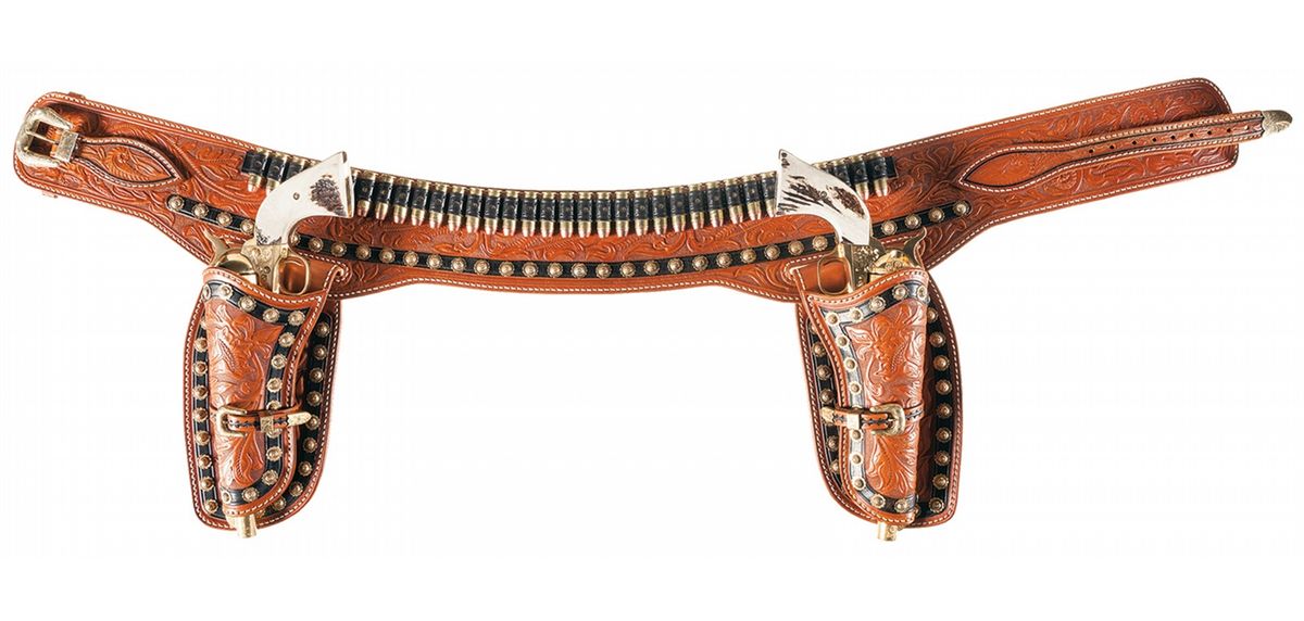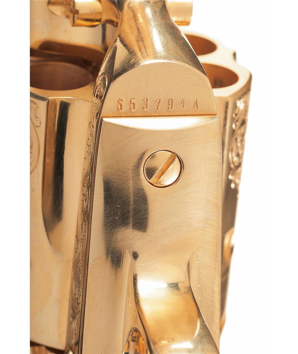 These revolvers were ordered by the Happy Trails Children's Foundation for the 2008 raffle drawing. There are flourishes of floral scroll engraving between the cylinder flutes, on the sides of the frame, on the loading gate, on the ejector rod housing and on the muzzle end of the barrel on either side of the front sight. The front sight is engraved with a feather pattern. The right side of the barrel is engraved "101RANCH" in a banner. The ejector rod housing is engraved "HAPPY TRAILS" in a banner. The loading gate is engraved with the serpentine Colt logo among the floral scroll. The right side of the frame is engraved with Roy Rogers jumping through a lasso. The back strap has some decorative engraving with "Silver Screen Legend XI" in script lettering. The ejector rod housing is signed "C. Anderson" on the bottom near the cylinder pin. Fitted with a set of genuine stag grips. The factory letter covers both revolvers and confirms that they are .45 Colt, 7 1/2" barrel, gold plated, stag grips, that they were shipped to Ray Beeson of Victor Valley Shooters Association, 20766 Sholic Road, Apple Valley, California on February 27th, 2007. The factory letter has a remarks section of "The revolvers were sent to Conrad Anderson, Rocktree Ranch for engraving and then sent to Bob Leskovec of Precision Pro Grips in Pennsylvania for genuine stage grips.". Comes with a hardwood display case that has a hand engraved likeness of Roy Rogers on the lid by Ben Hansen, of Beauty From Scratch, a tooled leather gun belt by Jim Lockwood, of Legends in Leather, having gold plated sterling silver hardware with the buckle, keeper and end cap signed or stamped by Conrad Anderson. Approximately 35 .45 Long Colt dummy cartridges, a blue Custom Shop box and the original box numbered to the gun. There is also a brochure that features beautiful photography of the revolvers and gun belt, outlines who performed the work on the different items in this lot and explains what the Happy Trails Children's Foundation does.