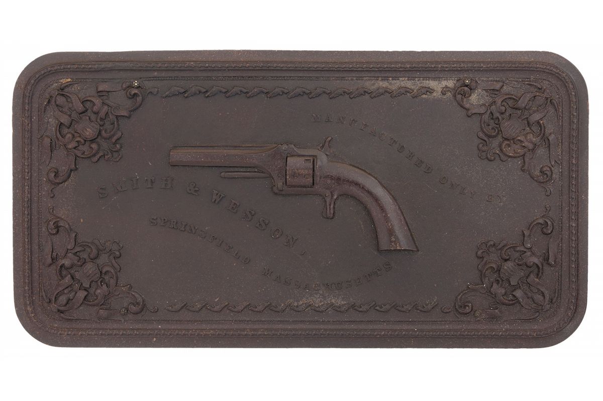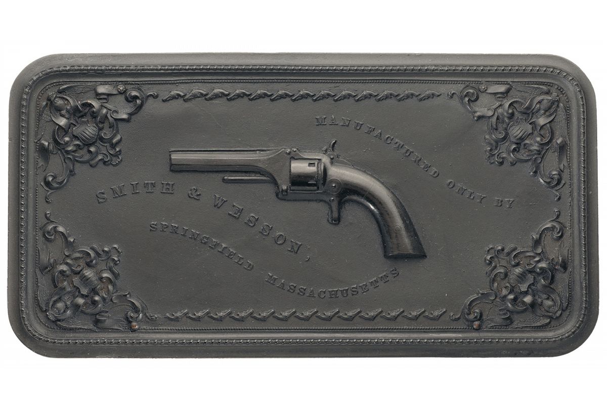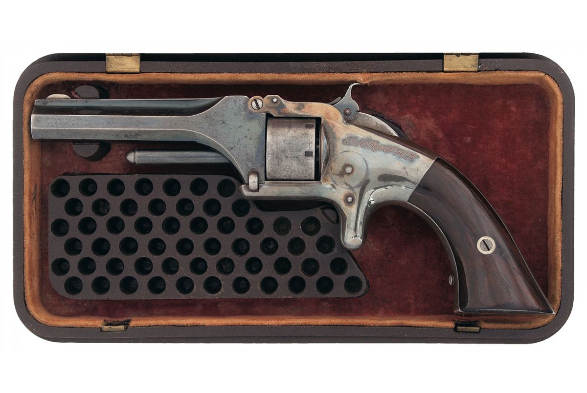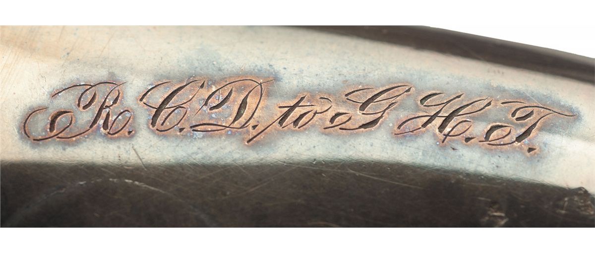Manufactured from 1857 to 1860. This is one of the final examples of the 6th and final variation of the so called 1st, 1st revolver. The top of the barrel rib marked "SMITH & WESSON SPRINGFIELD MASS." and the cylinder is marked with the 1855, '59 and '60 patent dates. The left side of the frame is period inscribed "R.C.D. to G.H.T.". The revolver has a brass blade front and notch rear sights, the frame is silver plated while the remaining parts were blue and it is fitted with smooth two piece varnished rosewood grips. Complete with an original Smith & Wesson Gutta Percha case with decorative carved lid with image of a Number One revolver and "MANUFACTURED ONLY BY/SMITH & WESSON,/SPRINGFIELD MASSACHUSETTS". The inside of the lid has decorative violet colored velvet and there is brown velvet on the bottom and a 56 round bullet block.
