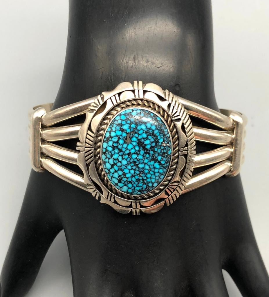 Presented for sale in this lot is a bracelet by Eugene Belone. This is a stunning bracelet that is set with a magnificent Kingman Spiderweb turquoise cabochon. It has a unique stacked bezel that gives the illusion of overlay. Stamped as sterling. MAKER: Hallmarked Eugene Belone, (Navajo). APPROX AGE: Modern. SIZE: Inside circumference measures 5-3/4 inches long. Opening is an additional 1-1/8 inches, fitting a 6-7/8 inch wrist. Width is 1-1/2 inches. Weighs 66 grams. CONDITION: Good for its age, normal wear expected. Please look closely at the pictures as they are an important part of our description and are hereby incorporated into the description, specifically with regards to condition. SHIPPING: There will be a $5 handling / packaging fee for shipping this lot. The actual cost of postage will be added on top of that. BUY IT NOW: If you would like to buy this item now, without waiting for the auction day to bid on it, we do offer this option (which is available up to 48 hours before the actual auction starts). The “Buy it Now” price is the high estimate of this lot (plus applicable fees and the Buyer's premium is discounted to 10% when using the Buy it Now option). If you would like to exercise this option, you must contact us by email (or phone as long as you talk to someone live). Reference this lot number and your intention to "Buy it Now."