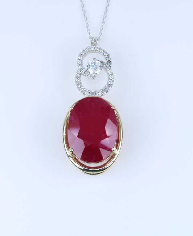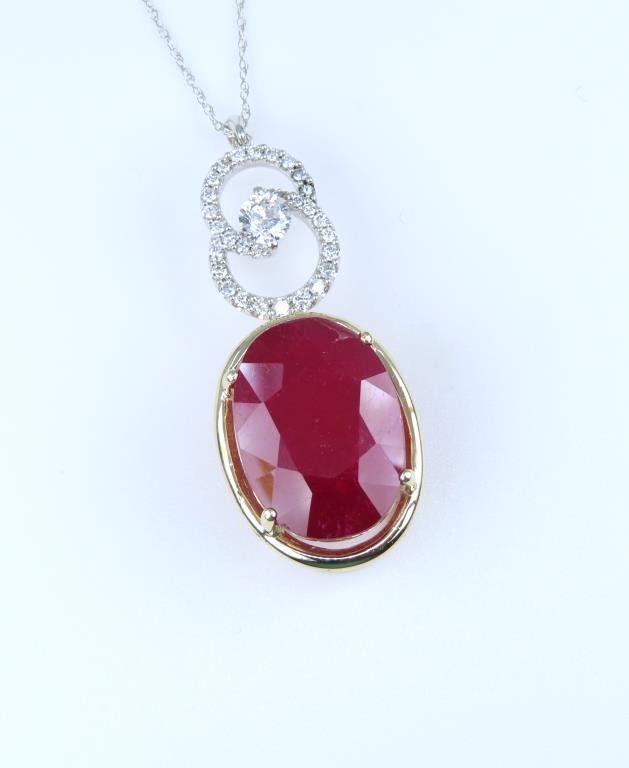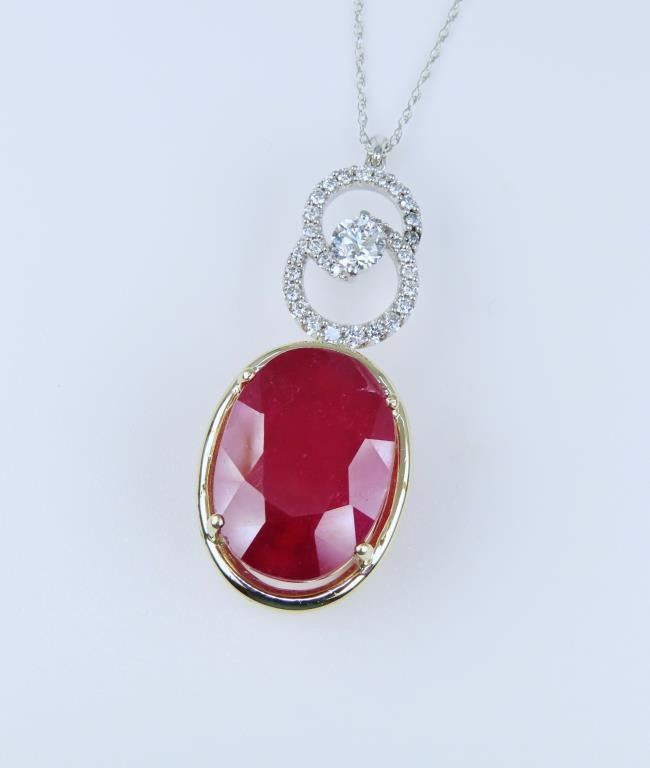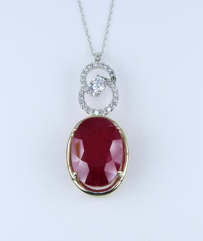 featuring an oval cut Natural treated Ruby weighing approx. 18.00-20.00 carats with rich Red color accented with 30 fine ‘IDEAL cut’ Diamonds weighing approx. 0.60 carats with F-G colors and VS clarity set in a custom 14 karat two-tone gold setting. Retail $6,000-$9,000