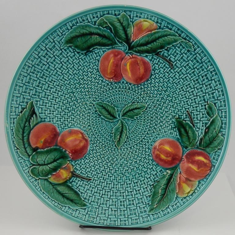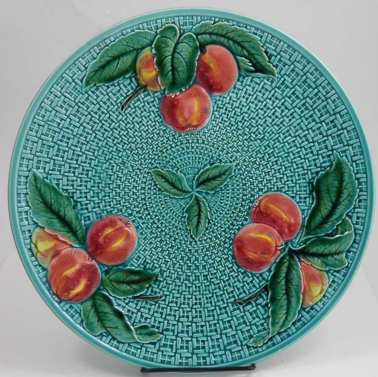 This plate's design shows fruit with leaves on a basket-weave design in turquoise. It has large pink and yellow peaches, with leaves in various shades of green.