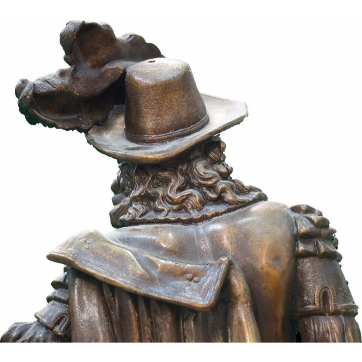 Measures 21.25" tall and 8.25" wide and 6" deep Cast metal conquistador with sword (illegibly signed) Perfect in every detail. Hand made casting for a single Newel Post.