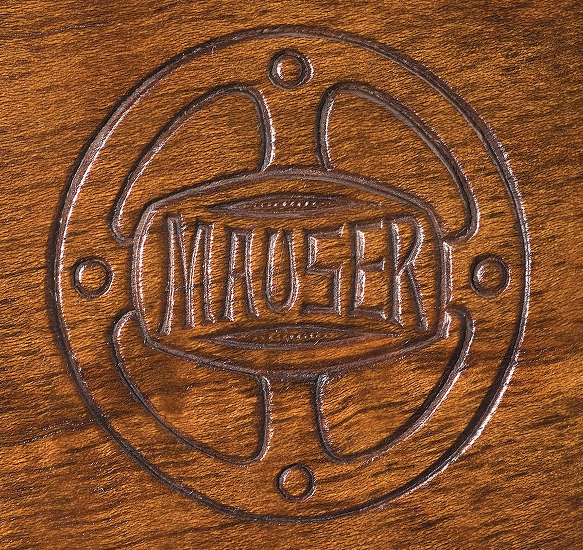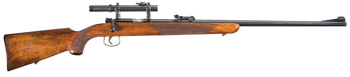 This World War II era Mauser bolt action rifle is equipped with a blade front sight and adjustable rear sight graduated from 25 to 200 meters. The left rear of the barrel is marked "KAL 22 LANG FUR BUCHSEN", the top of the receiver ring is marked with the Mauser banner and the left side is marked "MAUSER - WERKE A.G. OBERNDORF A./N.". The matching serial number appears on the left rear of the barrel and the receiver at the breech, and on the bolt handle. Nazi "eagle/N" proof marks are marked on the breech end of the barrel and receiver. Mounted with a one piece checkered pistol grip stock with a large Mauser logo on the right side. The scope is marked "OIGEE BERLIN" on the turret and "GNOMET 2 1/2x" just below.