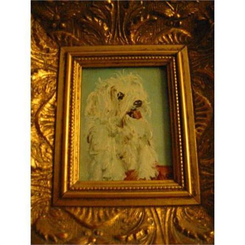 isn't this painting wonderful? ornate framing vintage and gorgious with cute dog terrier.it measures 10.5 x 9.5 x 4 frame, and in excellent condition with normal wear and tear. the signature is not readable.