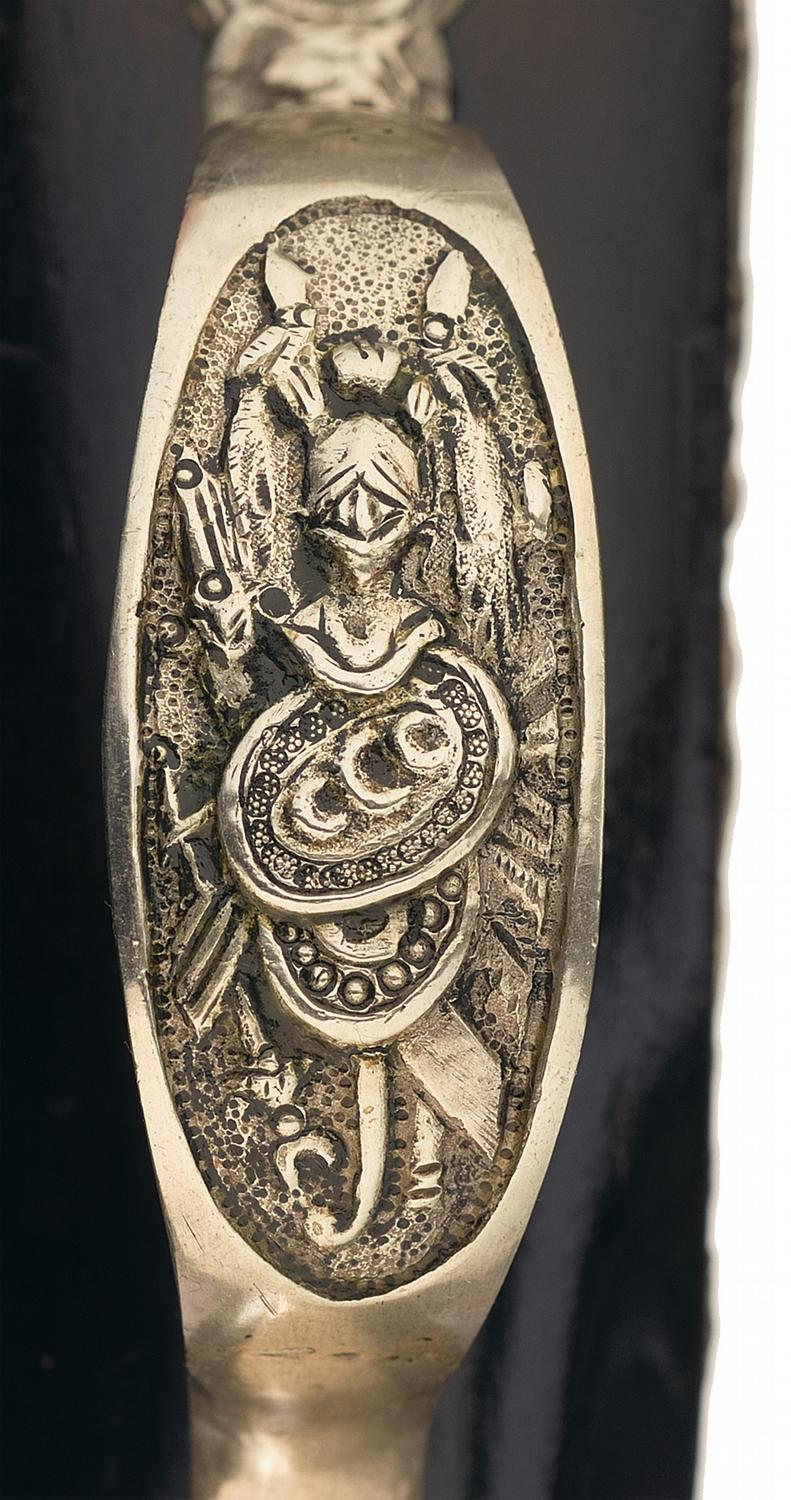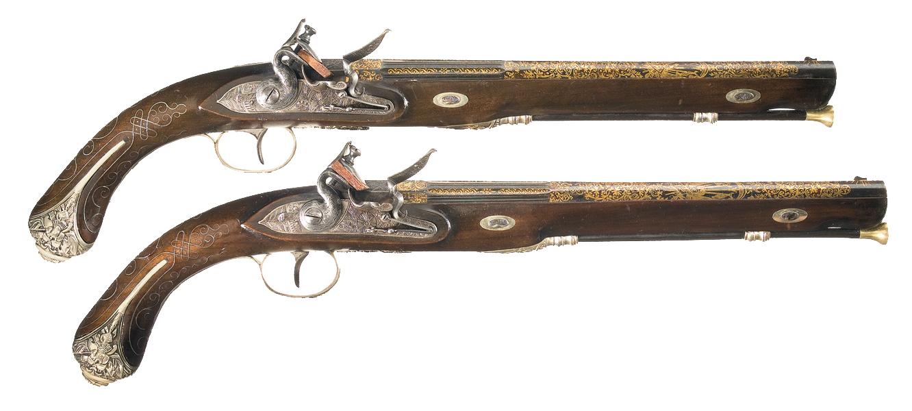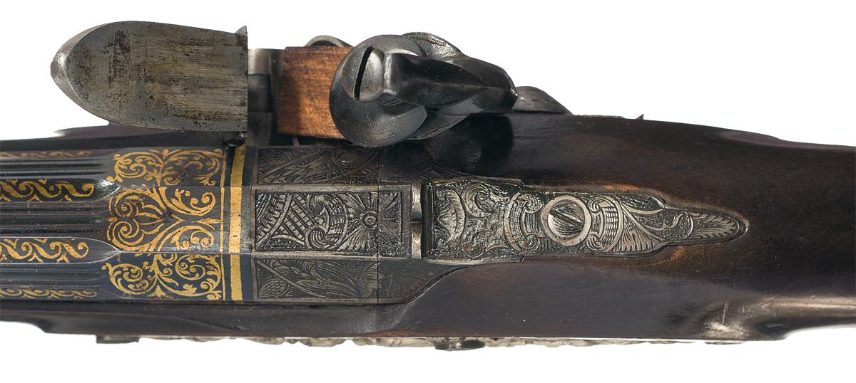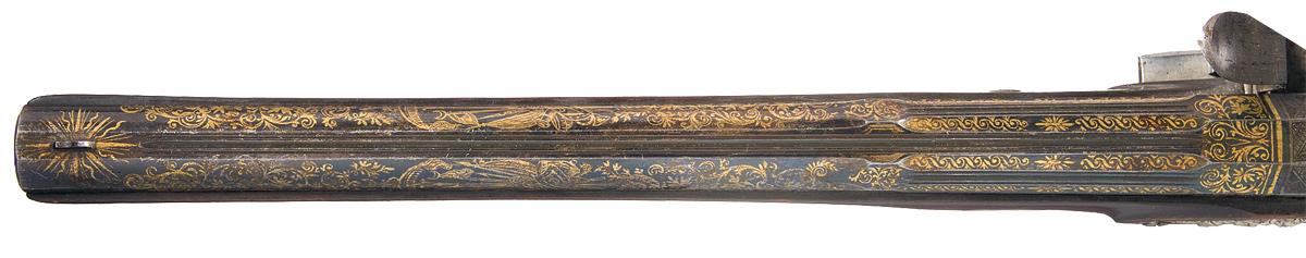 Condition: Very fine. The barrel retains nearly 90% of the original blue finish with scattered age discoloration. The gold inlaid decorations on the barrels are nearly all intact. The breech plugs and pans have no flash pitting and the breech plugs retain nearly all of the original case colors. The locks have a silver-gray patina with traces of the original case colors. The locks have no flash pitting and the engraving is crisp and deep. The pistol stocks are also in very fine condition, sharp edges and light handling and storage marks. The cast silver ramrod pipes, side plates, trigger guards and pommels are all in excellent condition with sharp edges on the relief castings. This is a magnificent pair of very high quality 18th Century pistols in outstanding condition and show the best European craftsmanship. Most likely they were made for the eastern trade to appeal to the wealthy individuals of that era.