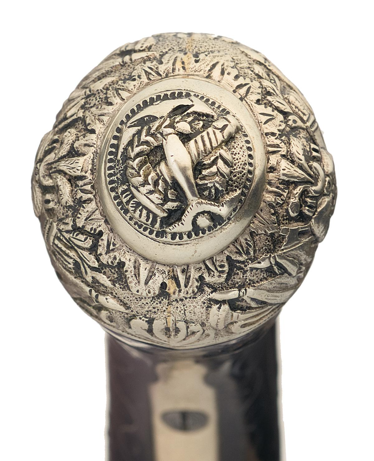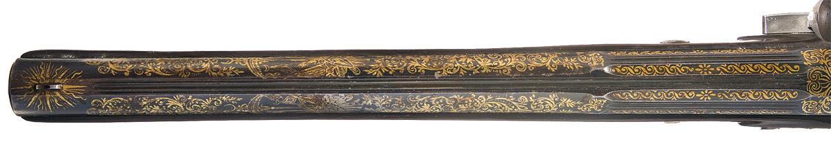 A) This matched pair of late18th Century European officer's pistols have part octagon/part round smoothbore barrels with fluted sighting plane and fluted edges of the octagon portions of the barrels. The barrels are blued and the breech plugs are color casehardened. The barrels are decorated with gold inlays that include sunrays surrounding the front sight blades, military stands of arms and colors on each side of the sight flats and delicate floral designs that extend the length of each barrel. The locks have goose-neck cocks, integral, fenced, iron pans and bar safeties. The lock plates, cocks, and frizzens are covered with relief engraving. The relief engraving extends to the breech plugs. The full length, wedge-fastened, European walnut stocks are decorated with inlaid silver wire scroll work on the grips. The ramrod pipes, trigger guard, side plate and strapped pommels are cast silver with stands of arms and military trophies in high relief. Each pistol has an ebony ramrod with flared brass tip and iron bottom. The pistols are not maker marked, but are stamped with the number "609" on the undersides of the barrels and inside of the trigger guards. The undersides of the barrels are stamped with a small "Crown/R" proof marks and the breech plugs are stamped with a "Crown/X" proof. The left side of both barrels are Liege proofed.