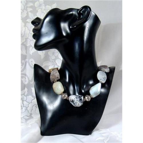Unique presentation of magnificent opals...complimented with sterling silver and completed to perfection with sterling silver 's' closure. The opal stones are fairly uniform with the center having measurements of 34x29x16mm and for those not familiar with metric 25mm=1". Flanked on both sides by 15mm sterling beads for perspective to size The necklace measures 20" in length and has a gram weight of 187 gram...so is a VERY substantial piece of jewelry worthy of consideration.</P>