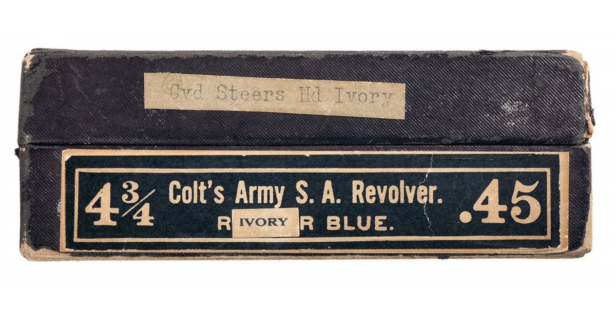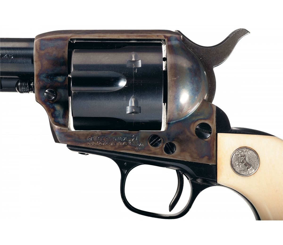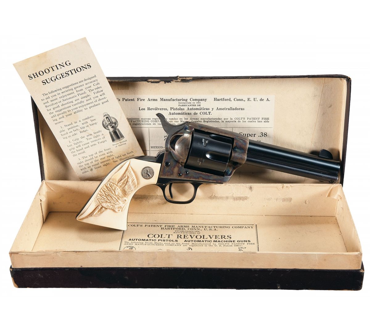 Manufactured in 1940, the last year of the first Generation Colt Single Action Army revolver. The top of the barrel is marked with the two line address and "COLT SINGLE ACTION ARMY 45" on the left side. The left side of the frame is marked with the two line, three patent dates followed by the Rampant Colt. The upper left front of the trigger guard is marked with the Colt triangle "VP" proofmark and the number "4". The matching serial number is marked on the bottom of the frame and on the right side of the grip straps under the grip and both grip panels are numbered to the gun. The assembly number "103" is marked on the loading gate. Blue finish with casehardened frame, blade front and frame notch rear sights, and fitted with two-piece ivory grips with a steer head carved on the right panel and silver Colt medallions. Complete with the original black hinged lid box numbered to the gun with end label reading "IVORY" over "RUBBER" for the grips and "Cvd Steers Hd Ivory" sticker on the top lid end flap and wire brush.This firearm's serial number is only 31 numbers away from lot 3256 sold in September 2012 auction.