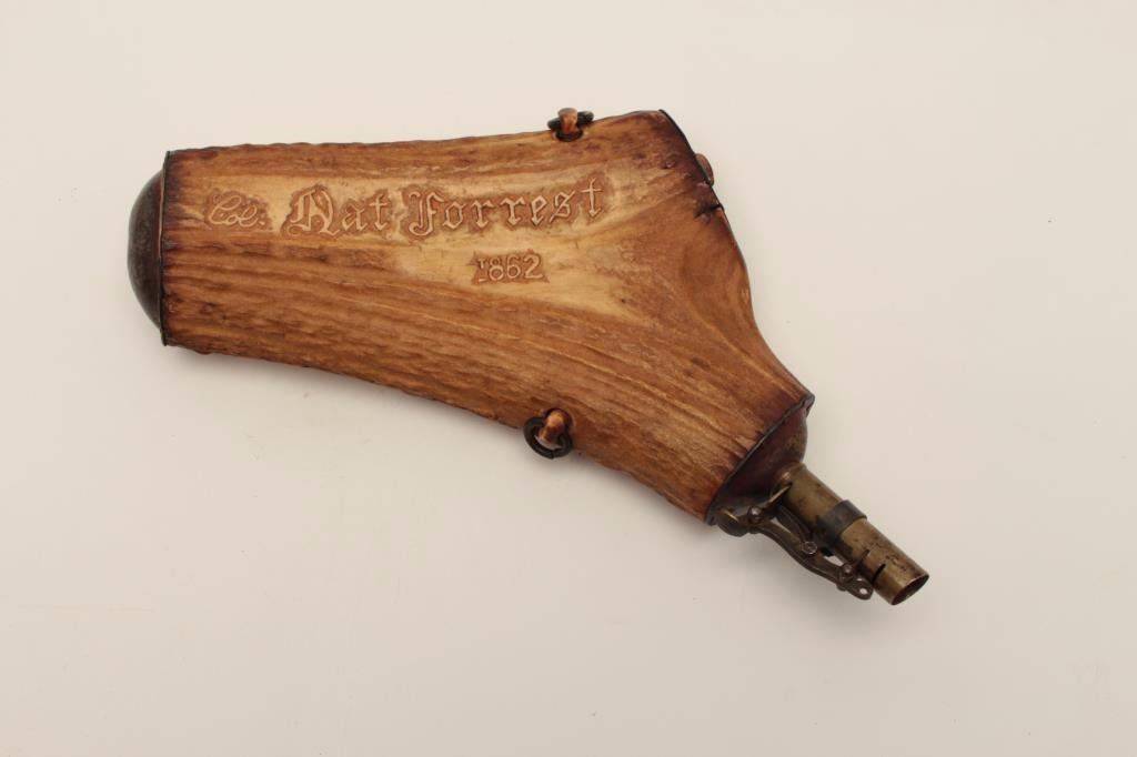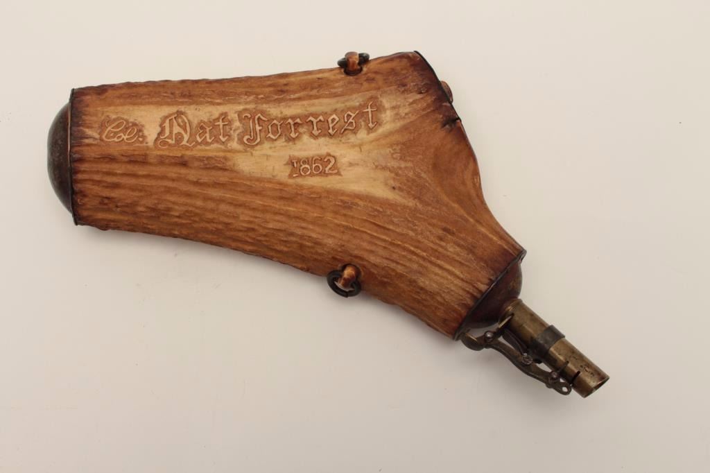 Magnificent Raised Carved Powder Horn showing Eagle, Stand of Arms, and C.S.A. Reverse also Relief Carved Col. Nat. Forest 1862. Nathaniel Bedford Forest was one of the most colorful and bold Confederate Commandersduring the Civil War. His adventures and exploits are subject of many volumes. Documenting letter of Provenance from Walter O'Connor who is generally considered the Foremost Living Expert on American PowderHorns who's letter pronounces absolute originality to 19th Century. It is the only 19th Century Powder Horn this Top Expert cared to keep in his Personal Collection almost 35 years. Approx. 8 1/2" by 6" acrosswidest part and made from Crotch of Moose Antler. Great metal and Carving worn with charger spout, utilized from mid 19th Century shot flask. The Best Imaginable Carving. Est.:$10,000-20,000