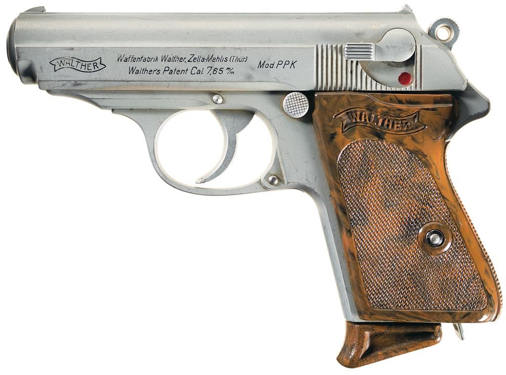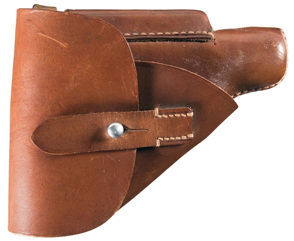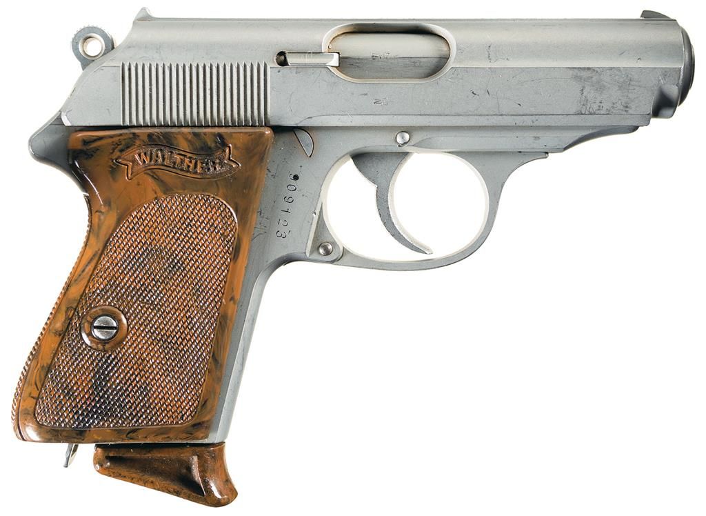 This is a very desirable early production Walther PPK with the Verchromt finish. Fixed sights, with black fill in the Walther banner, two-line address and caliber marking, and "Mod. PPK" on the left side of the slide, and "crown/ N" proofs on the slide, chamber and muzzle. Proper hand marked partial serial number on the inside of the slide, with a 90 degree safety, ring hammer, and checkered Walther banner grips. Complete with commercial brown leather holster that is marked "Walther/PPK" on the inside and a correct Verchromt finished magazine, with finger extension brown base and "WALTHER" banner on the left side.