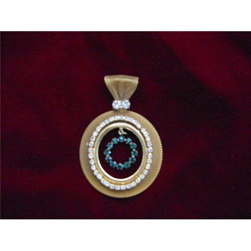 This Magnificent vintage 3.75 inch gold tone Mesh metal pendant is ornate and is decorated with circle of oval style shiny white rhinestones. It also has an attached circle of green rhinestones. This gorgeous pendant is excellent condition. However, The green can be replace with favorite of kind. Perhaps portrait, a watch pendant or a single stone. width 2.5 inch and Something to think about!