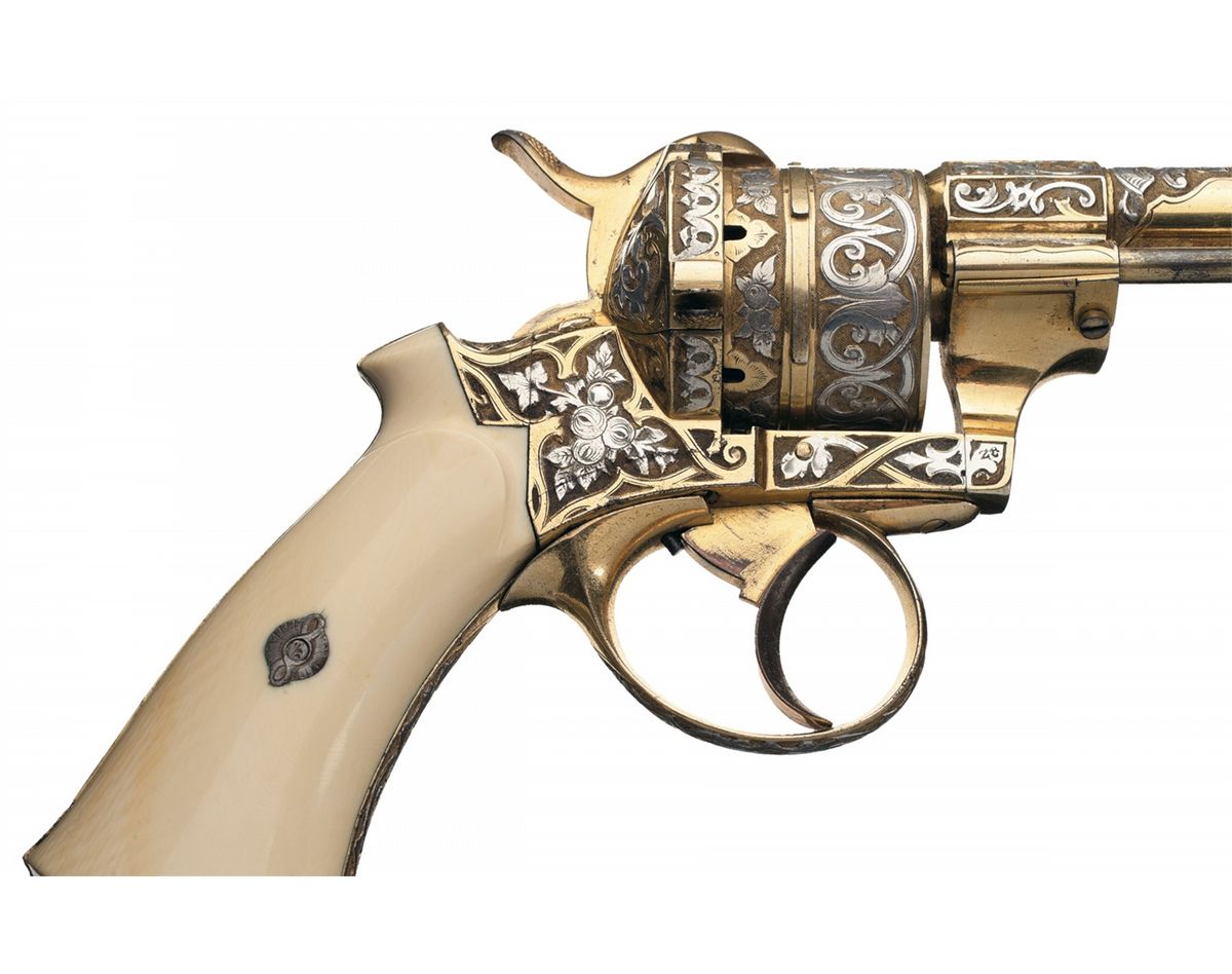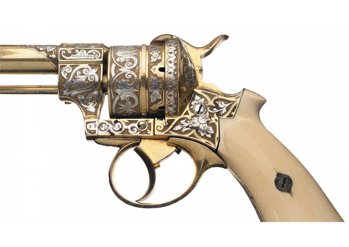 This is a beautiful example of a exhibition grade French pinfire revolver which features a very unique two tone gold finish and silver relief chiseled floral engraving on the barrel muzzle, breech and lug, cylinder, frame, trigger guard and grip straps. The only marking is on the left rear barrel flat, a "crown/EL" over "ACIER FONDU" (translated cast steel). There is an ejector rod mounted on the right side of the frame, Lanyard ring on the butt, high post front and hammer notch rear sights. Fitted with smooth ivory grips. The revolver is complete in a wooden case with inscribed brass shield on the lid, brass corner protectors and double inlaid brass bands on the lid. The lining is blue satin with a gold rope accent in the lid and French cut blue velvet in the case. The interior has two covered compartments with ivory pulls. In the case is a short ivory handled soft brush, possibly for the cylinder chambers, an ivory handled screwdriver, ivory handled cleaning rod and ivory oiler.