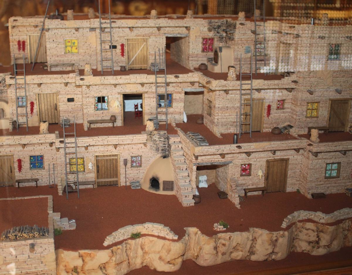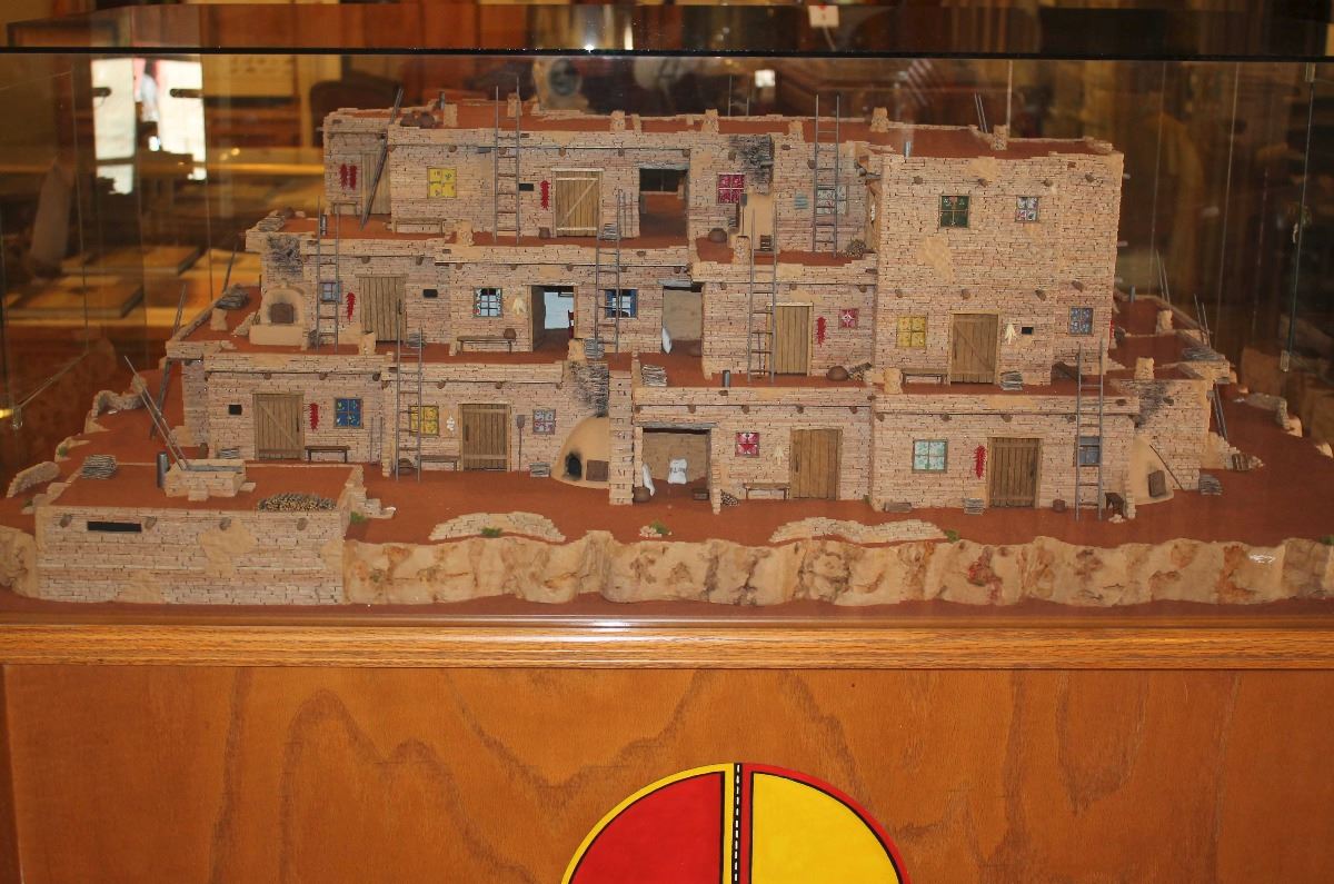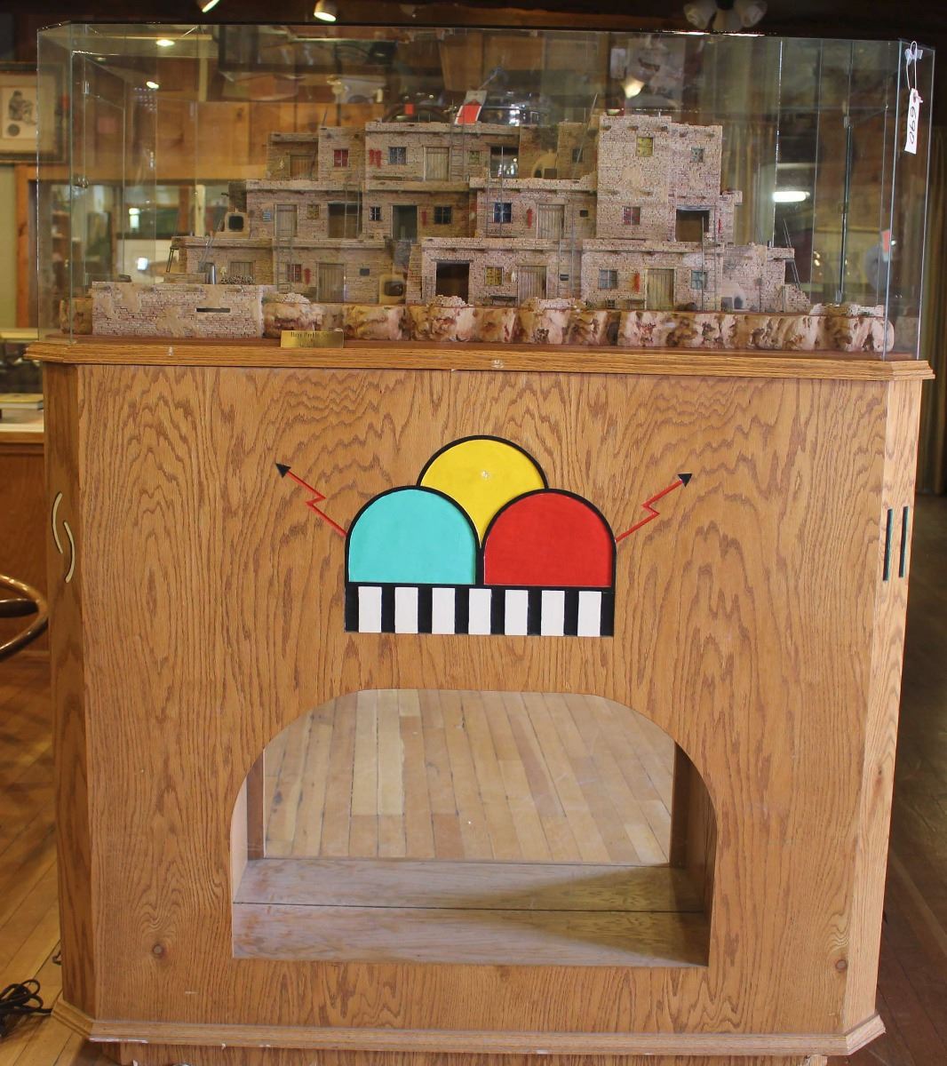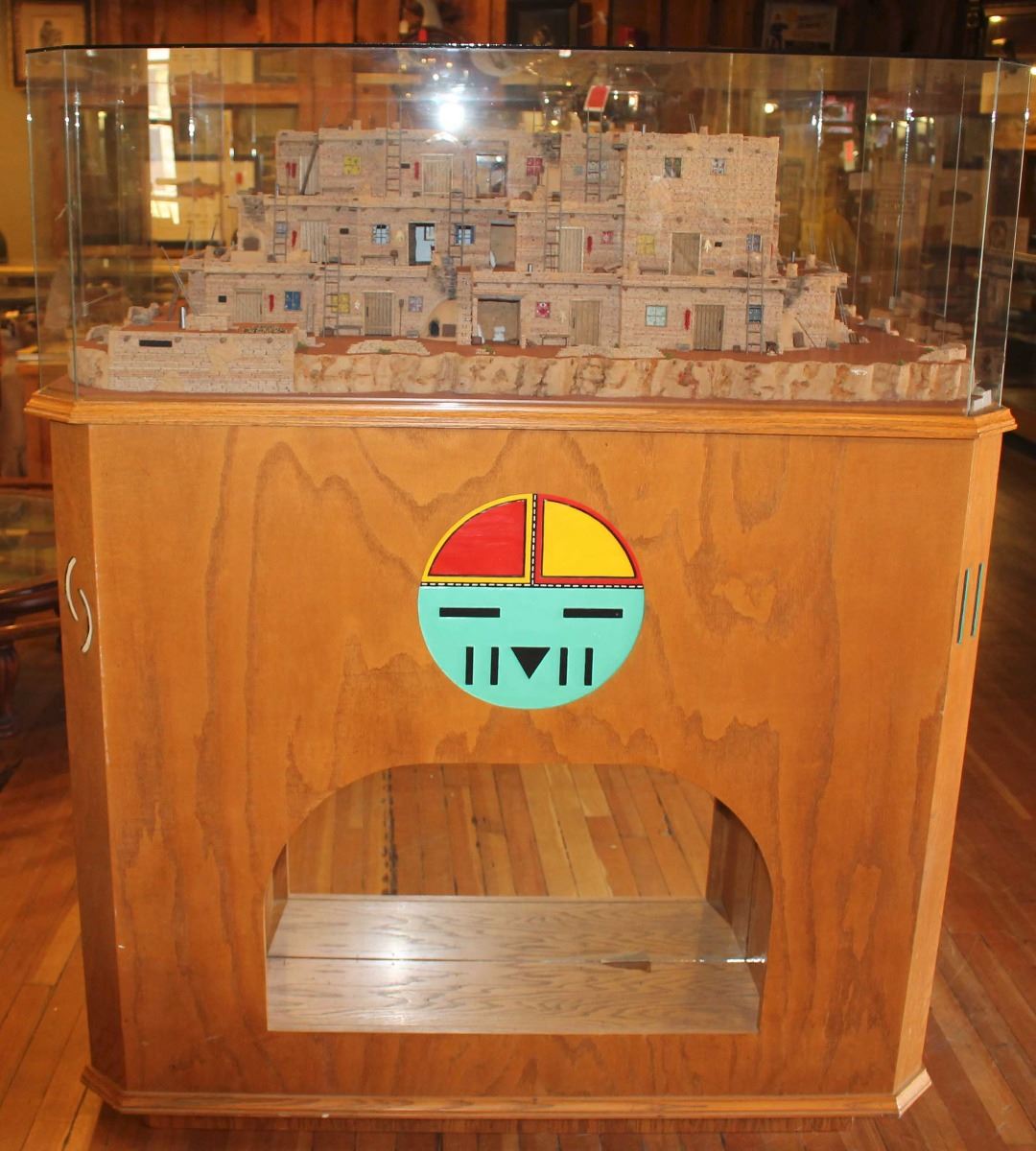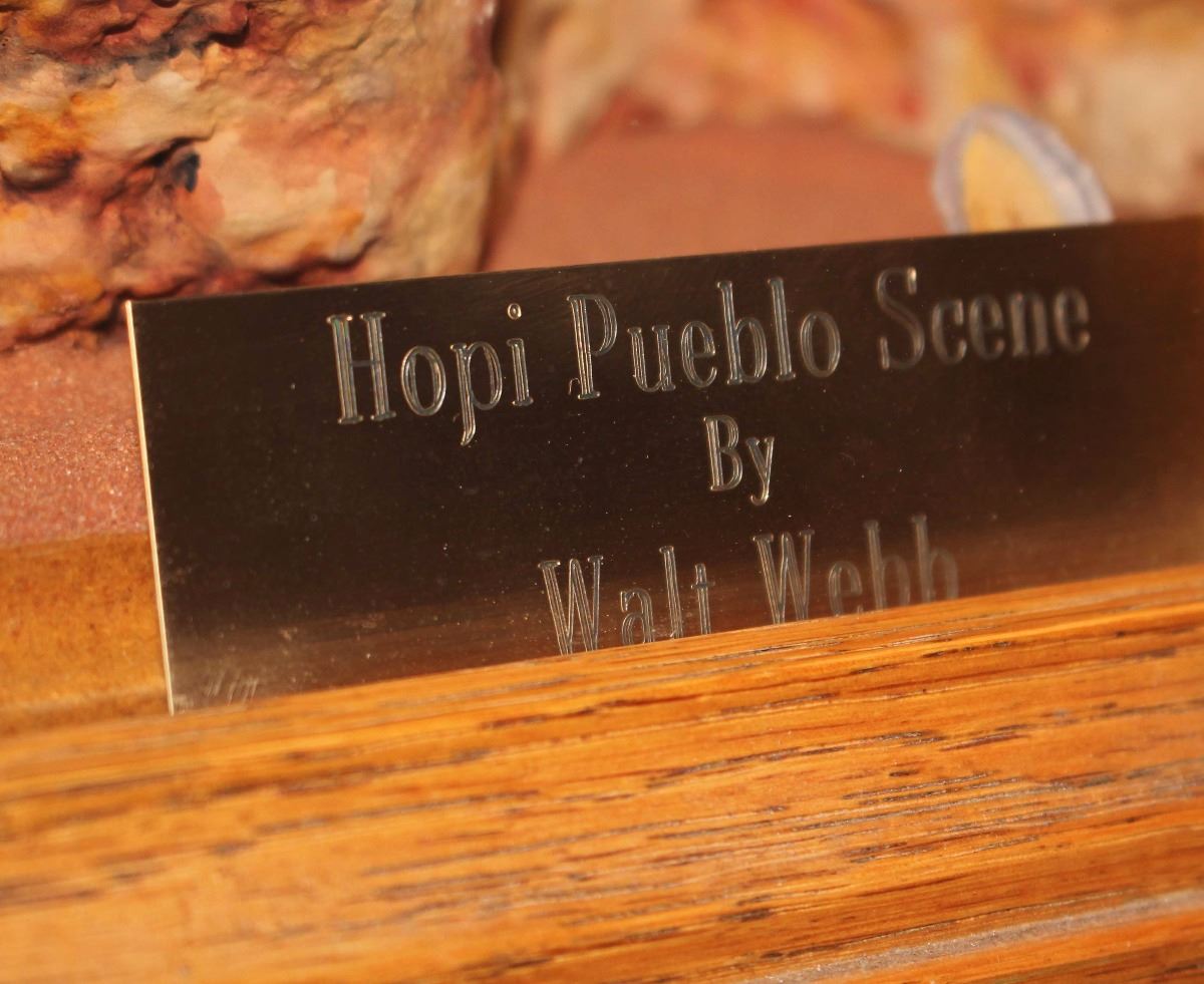Beautiful museum quality Hopi pueblo scene by Walt Webb. Features an intricate three story pueblo design complete with: doors, windows, stair cases, ovens, ladders, roofs & supports, storage areas, breezeway, chimneys, Kivas, wood stacks, landscape, cliff, tables & chairs, open rooms, tools, pots a glass case and mirrored, painted and lit carved oak stand. Includes a break down of the tedious 1,231 hours it took Walt to create this outstanding piece. Comprised of 27,200 hand chiseled stones. Glass has a single crack. Measures 50" x 36" x 60". Condition is excellent.