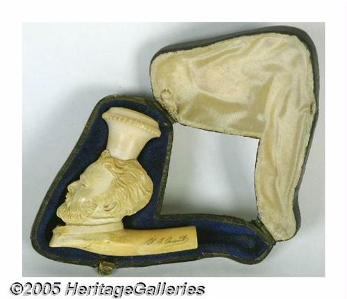 <B>Magnificent Ulysses S. Grant Meerschaum Pipe</B></I> Wonderful, highly detailed portrait, with simulated "U. S. Grant" signature printed on side of stem. Unquestionably the finest political/Presidential pipe of this era we have ever seen! Excellent condition, with original velvet-lined leather case. Clearly a quality object even when first made. Overall 3.5" x 2.5" in case. Lot:259
