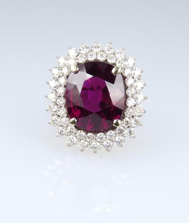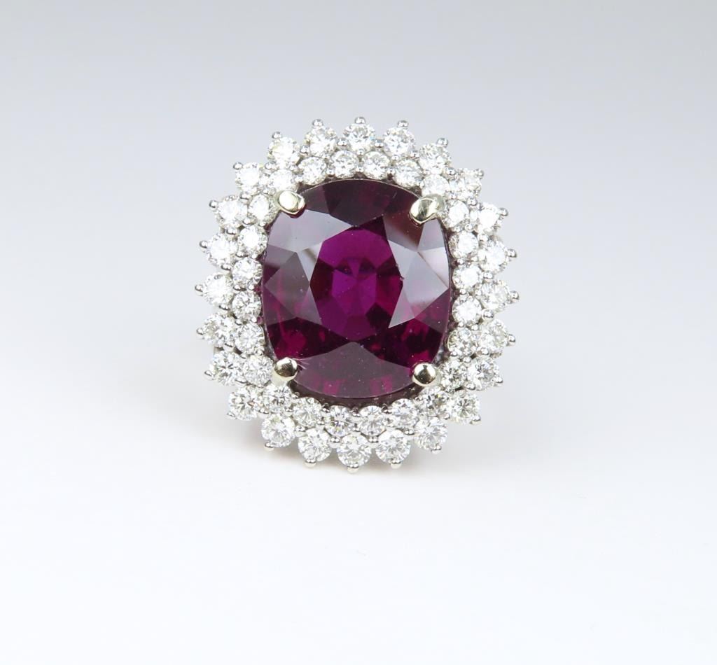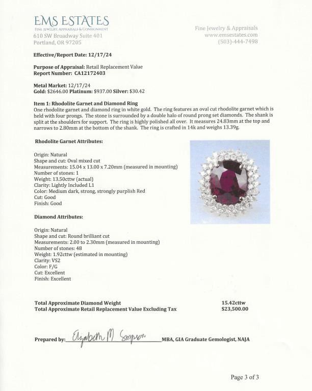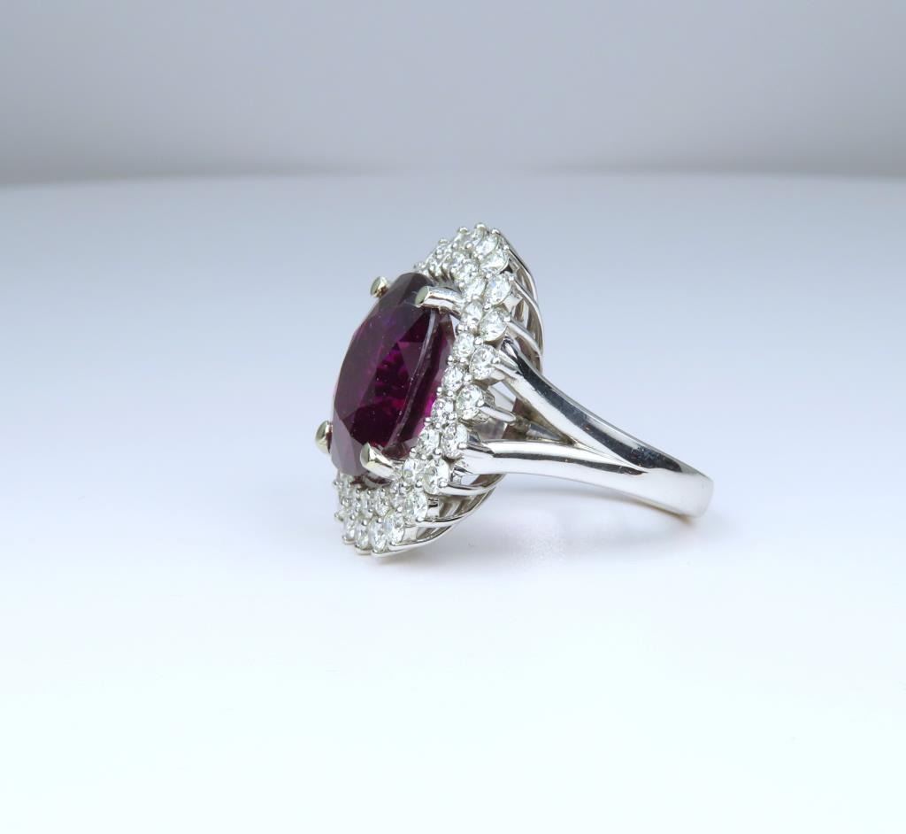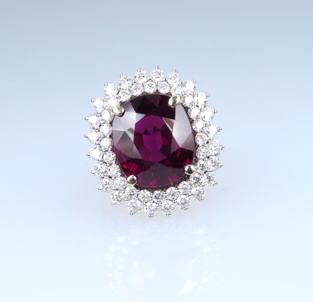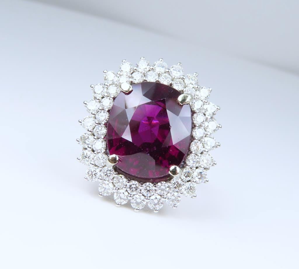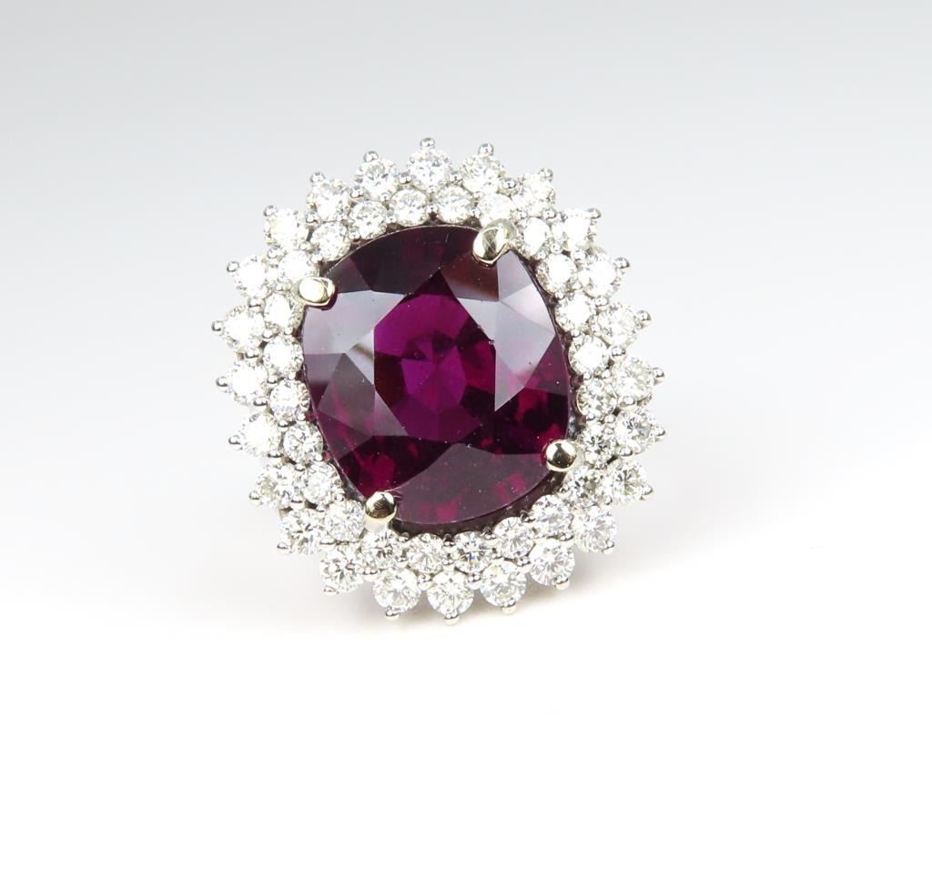and Diamond Ring featuring an oval cut approx. 13.50 carats cushion cut Purplish Red Garnet framed with 48 fine set ‘IDEAL’ cut Diamonds weighing approx. 1.92 carats with F-G colors and VS clarity set in a gorgeous custom setting weighing 40 grams of 14 karat white gold, size 7. Full Appraised Retail Value - $23,500.00