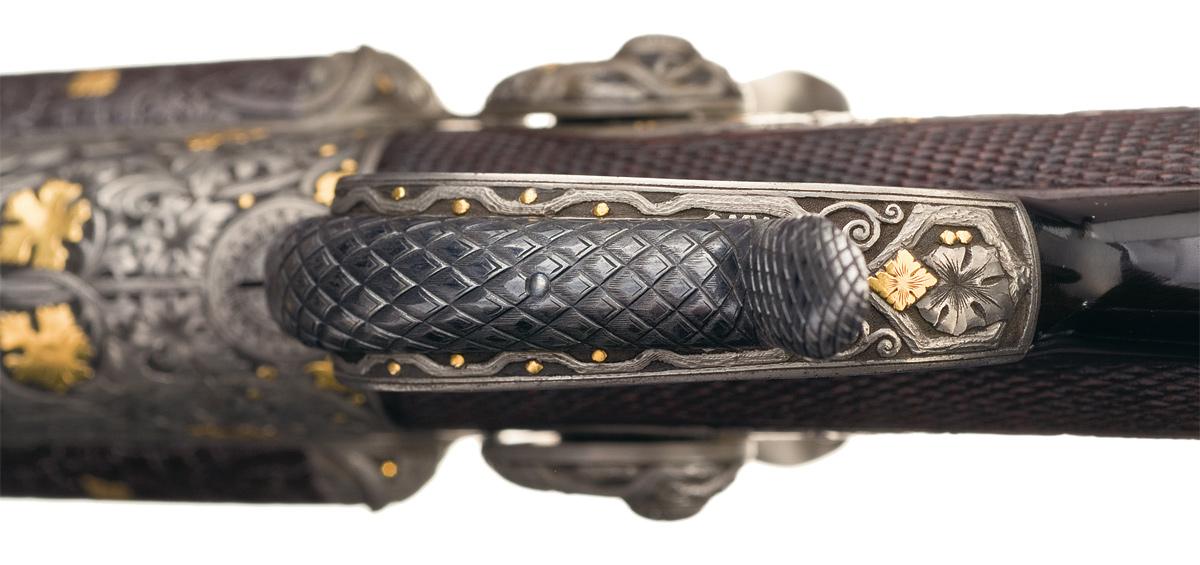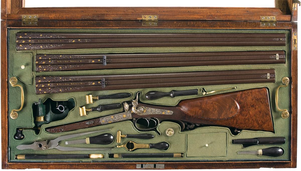 Condition: Excellent overall. All sets of barrels retain at least 98% original brown finish with a very attractive Damascus pattern. The remaining surfaces have a smooth gray patina. All of the gold inlay remains. With the exception of a small chip on the rear of the forearm at the frame juncture, the wood is excellent with a few minor dings and handling marks. The case and all accessories are very fine with some wear to the lining. An exquisite piece of art.