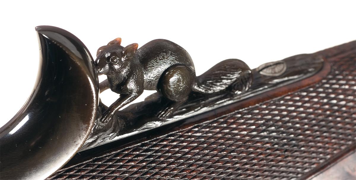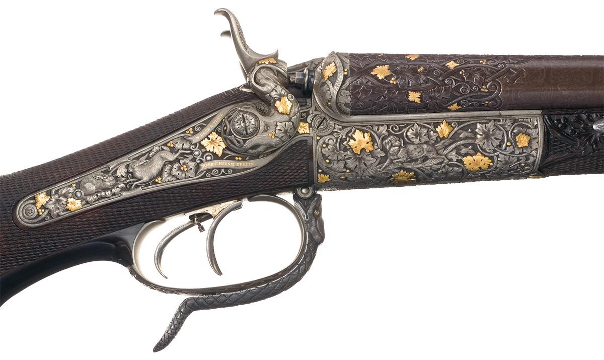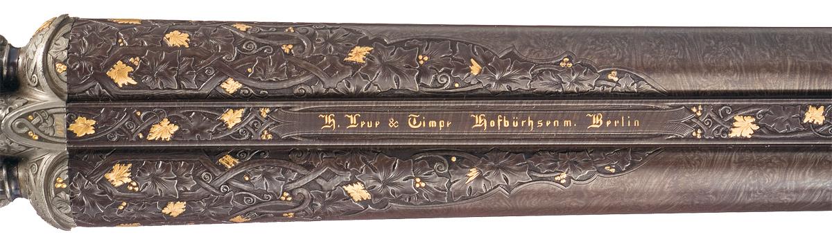 This exquisite rifle shotgun combination features three sets of barrels. One set of barrels is 27 3/4" in length, with a 16 gauge barrel on the left side, with 2 1/2" chamber and an extractor. The right barrel is rifled 20 bore with 2 1/2" chamber. It has a German silver dove tailed blade front and fixed "V" notch leaf rear sight. The second set is 30" in length, 16 gauge with 2 1/2" chambers, single brass bead sight and extractor. The third set is 26 5/8" in length with 20 gauge rifled (6 groove) barrels, dove tailed German silver blade front sight and "V" notch rear leaf sight and extractor. All three sets of barrels have a solid rib and sling swivel mounted on the bottom. All are Damascus with deep relief chiseled vine leaf designs around the front sight, on the breech ends extending 5 1/2" and on the breech end of the rib extending to just ahead of the rear sight, with scattered gold inlaid leafs and berries. Each rib is gold inlaid with the makers mark "H. Leue & Timpe. Hofburhsenm, Berlin.". The frame, hammers, trigger guard and back locks are also deep relief chiseled with vine leaf patterns (also branches on the hammers) with scattered gold inlaid leafs and berries. In addition there is a running deer on the left side of the frame, hunting dog on the right side, a hare on the right lock and two pheasants on the left lock. Each lock has two banners, above and below the hammer gold inlaid "H. LEUE & TIMPE" in the upper and "HOFBURHSENM, BERLIN" in the lower. The under lever is mounted directly ahead of the trigger guard and is chiseled relief cross hatch pattern. The hammers have high checkered spurs. The rear trigger guard tang is horn with a finely detailed carved squirrel at the rear. Adjustable double set triggers and mounted with a hand carved and checkered splinter forearm with vine leaf and berry designs and carved beetles for the bolt terminals. The straight grip stock has a hand checkered wrist, the fruiting vine design on the high edge of the cheekpiece and checkered buttplate with the fruit leafs on the heal with some gold inlay. The barrels are Birmingham proofed. Complete in a walnut veneer two tier case with a glass lid and German silver corner protectors. The tops of the ones on the lid are engraved with the a fruit vine design. The upper lift out tray contains a bullet mold, shot and powder ladles, turnover tool, rammer, case cutter, cartridge cutter, two turn screws, oiler, and cleaning rod. The bottom compartment has compartments for ammunition.