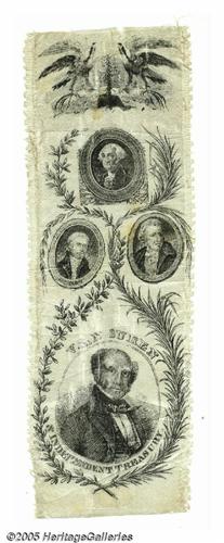 <B>Magnificent and Extremely Rare 1840 Martin Van Buren Silk Ribbon</B></I> Pictures him with Washington (claimed by both Democrats and Whigs!) and revered party founder Thomas Jefferson, along with Van Buren's predecessor and mentor, Andrew Jackson. All Van Buren ribbons are rare, and this is without a doubt the most beautiful and desirable portrait variety! Basically has great appearance: quite "minty" feeling. For accuracy we note several trivial, small, light stain marks and a few very minor little incipient vertical pulls in the weave of the silk; but, as the photo shows, overall condition is extremely pleasing. One of only several known, and one of the real prizes of the former Joe Brown Collection. Length 7.25". Lot:256