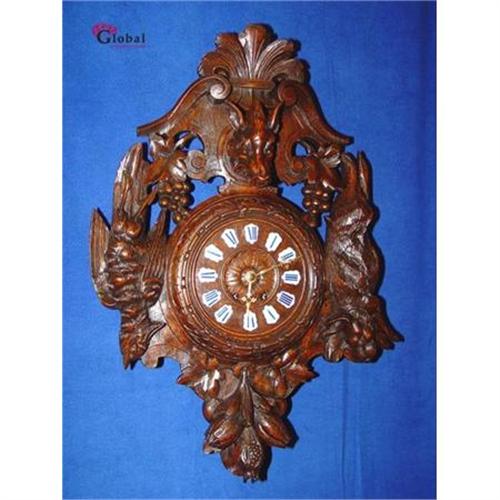 SIMPLY STUNNING!! We are very proud to offer you this marvelous carved wall clock that dates from the last quarter of the 19th C. (c. 1890).This clock is everywhere an absolutely eye catcher.The clock is made of the finest oak and has a very nice sound when he strikes on a gong every 30 minutes.The dial has enamel blue Roman numbers with brass handmade hands.The carvings are outstanding with a rabbit,a pheasant ,flowers and fruit.The patina of the wood is marvelous and the clock work is in fine working order.On top of the clock there is a magnificent carved wild boar head!The dimensions are: Height: 28 Inches, Width: 20 Inches and Depth 8 Inches.This clock is the ultimate way to bring some high end style to your decor! No matter where you place this Emipre clock everyone will be begging to know where you got such an outstanding clock and where they can get one like it!We bought this fantastic clock out of a castle in the South of Germany near Munich. Regarding shipping we will pack the clock in a wooden box so you will receive it without damage.Shippingscosts to the U.S.A. are 195 US$. After payment you will receive the clock in about 5 days.This is a very exceptional clock for the collector or someone wanting an unusual wall clock that no one else has!!Thank you for looking this great Black Forest wall clock. Sincerely,Wil Tegenbosch,Global Antiques Holland.