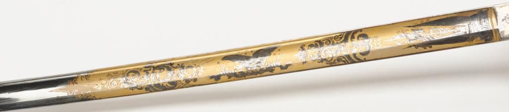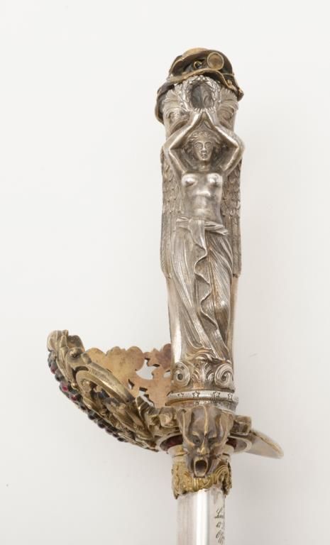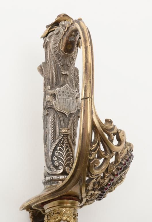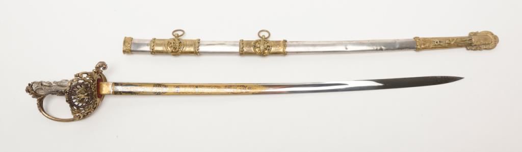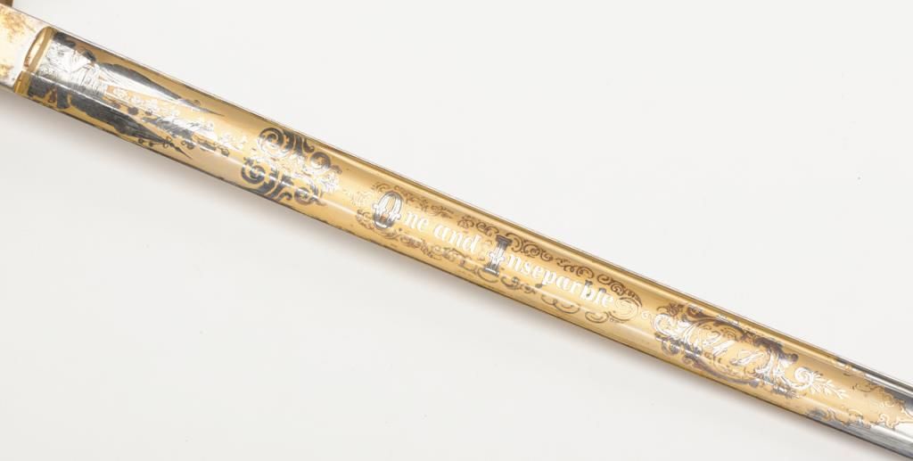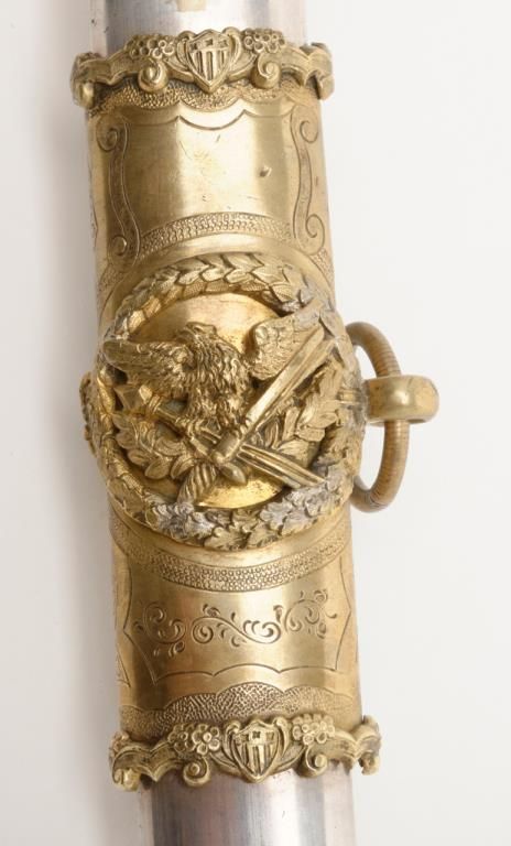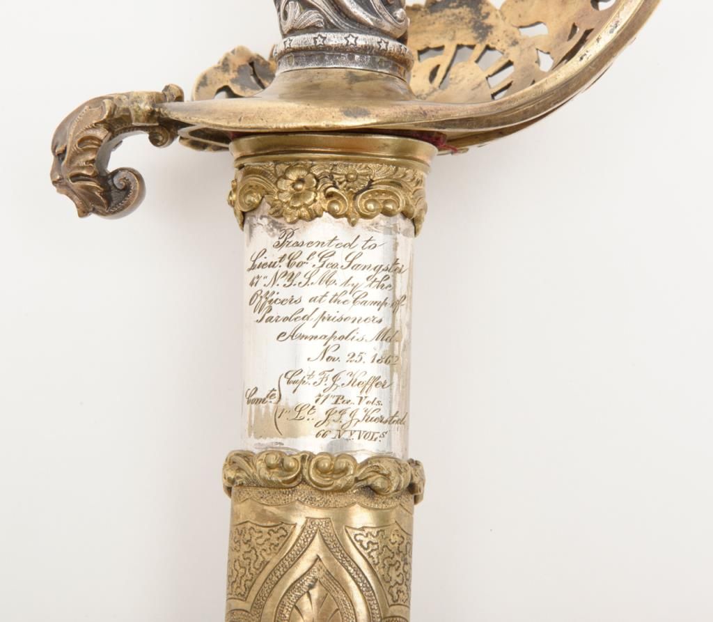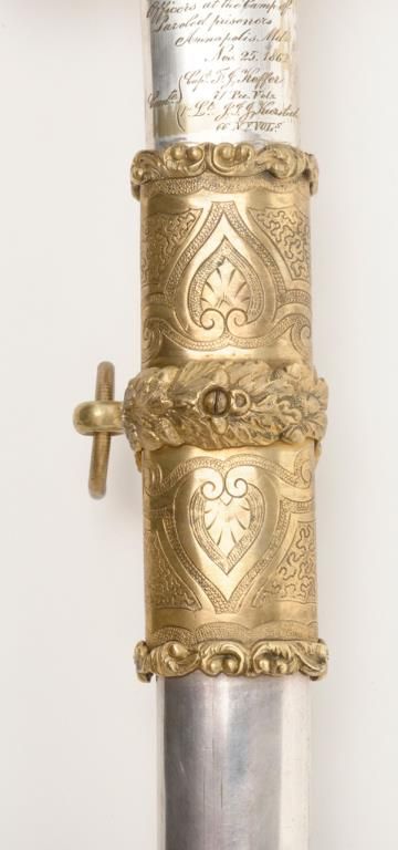 Magnificent and extremely high grade Civil War presentation statue hilted officer’ swords in near fine condition obtained by our consignor from the personal collection of iconic arms dealer and edged weapon expert Norm Flayderman. The castsilver colored metal grip shows a semi-nude and bare chested lady holding a laurel wreath and a Union shield on the reverse all joined by intertwining scrolls. The guard of the sword shows an American Eagle surrounded by red gemstoneswith fancy scrollwork and piercing. The top of the grip is surmounted by a Cavaliers style hat perched on the top of a Canon barrel. The mounts of the sword are high relief with stands of arms, Eagles and the drag shows a Civil War soldierframed by crossed flags. The mounts are hand engraved as accents. The reverse of the scabbard is inscribed “Presented to Lieut. Col. Geo. Sangter, 47th N.Y.L.M. by the officers at the camp of Paroled prisoners, Annapolis, MD., Nov.25, 1862, Comte. { Capt. F.J. Keffer, 71st Pa. Vols., 1st Lt. J. F.J. Kiersted, 66 N.Y. Vols.” The blade is in fine to excellent original condition showing a bright original polish and 95% to 98% original gold gilt with slogan, “One and