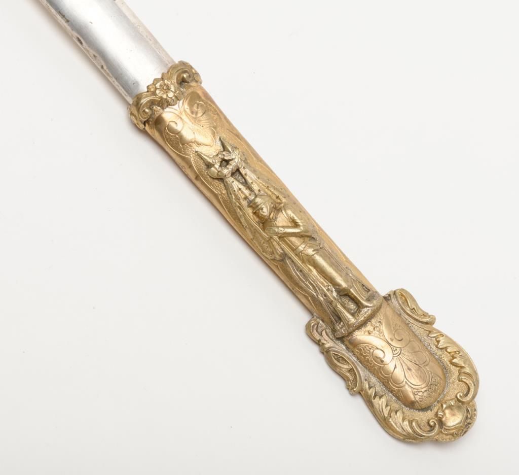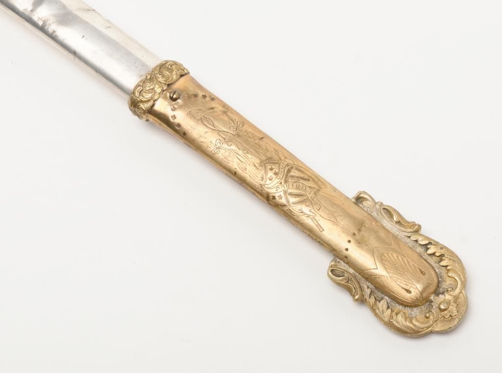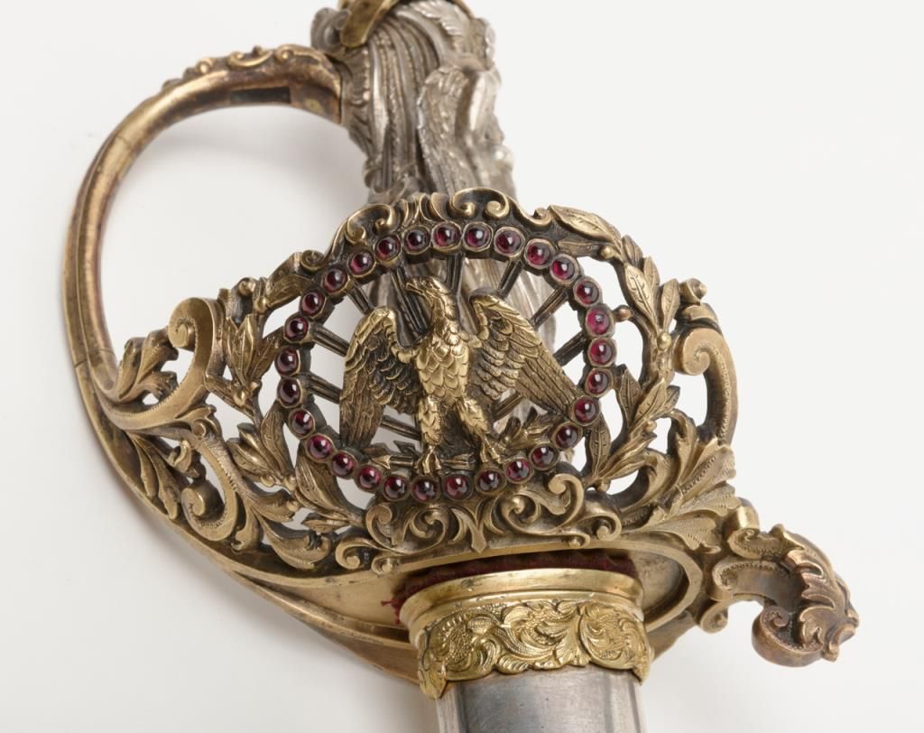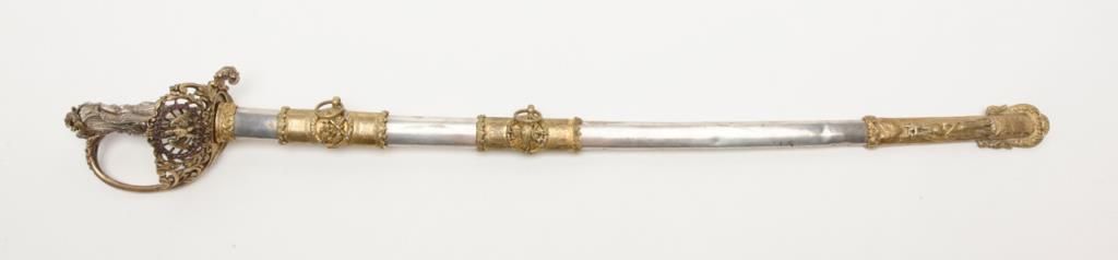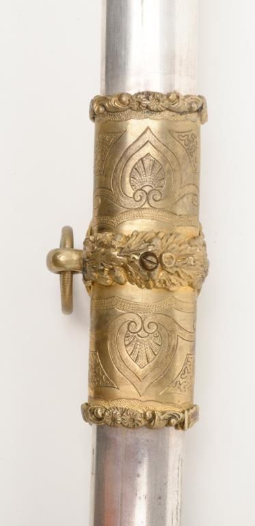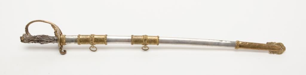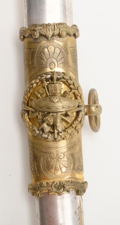 Magnificent and extremely high grade Civil War presentation statue hilted officer’ swords in near fine condition obtained by our consignor from the personal collection of iconic arms dealer and edged weapon expert Norm Flayderman. The castsilver colored metal grip shows a semi-nude and bare chested lady holding a laurel wreath and a Union shield on the reverse all joined by intertwining scrolls. The guard of the sword shows an American Eagle surrounded by red gemstoneswith fancy scrollwork and piercing. The top of the grip is surmounted by a Cavaliers style hat perched on the top of a Canon barrel. The mounts of the sword are high relief with stands of arms, Eagles and the drag shows a Civil War soldierframed by crossed flags. The mounts are hand engraved as accents. The reverse of the scabbard is inscribed “Presented to Lieut. Col. Geo. Sangter, 47th N.Y.L.M. by the officers at the camp of Paroled prisoners, Annapolis, MD., Nov.25, 1862, Comte. { Capt. F.J. Keffer, 71st Pa. Vols., 1st Lt. J. F.J. Kiersted, 66 N.Y. Vols.” The blade is in fine to excellent original condition showing a bright original polish and 95% to 98% original gold gilt with slogan, “One and