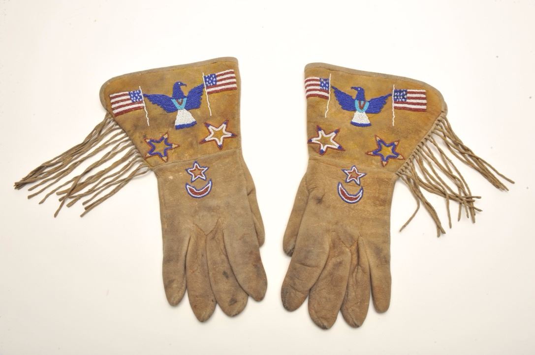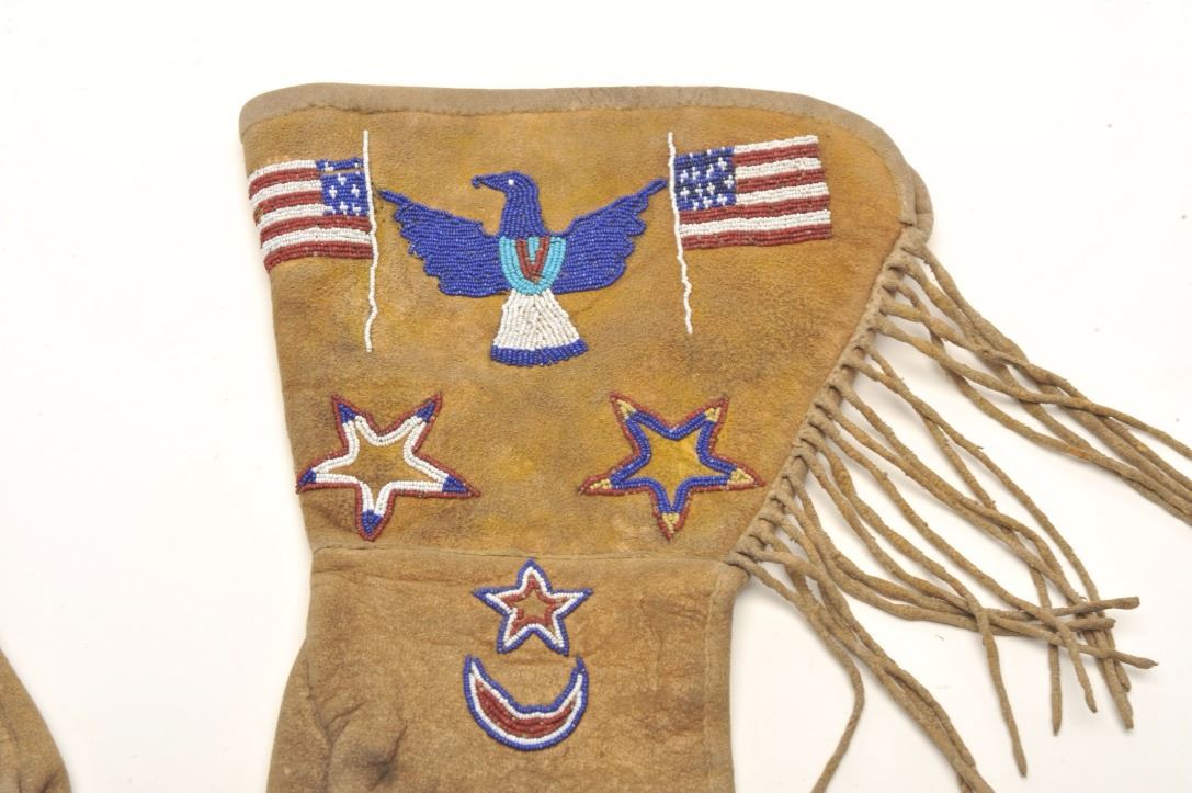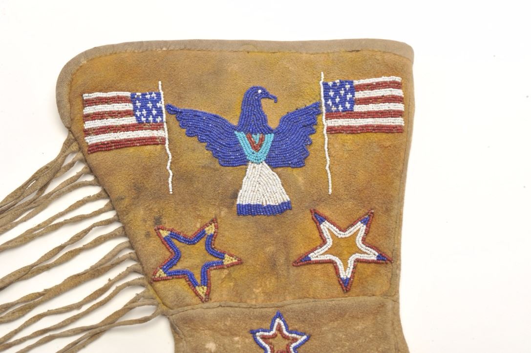 Magnificent beaded pair of trade cloth lined gauntlets with American Eagles and Flags; The best a collector could buy in nearly 40 years of collecting; visually stunning!! Est.: $4,000-$8,000.