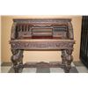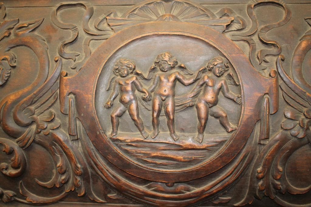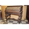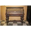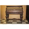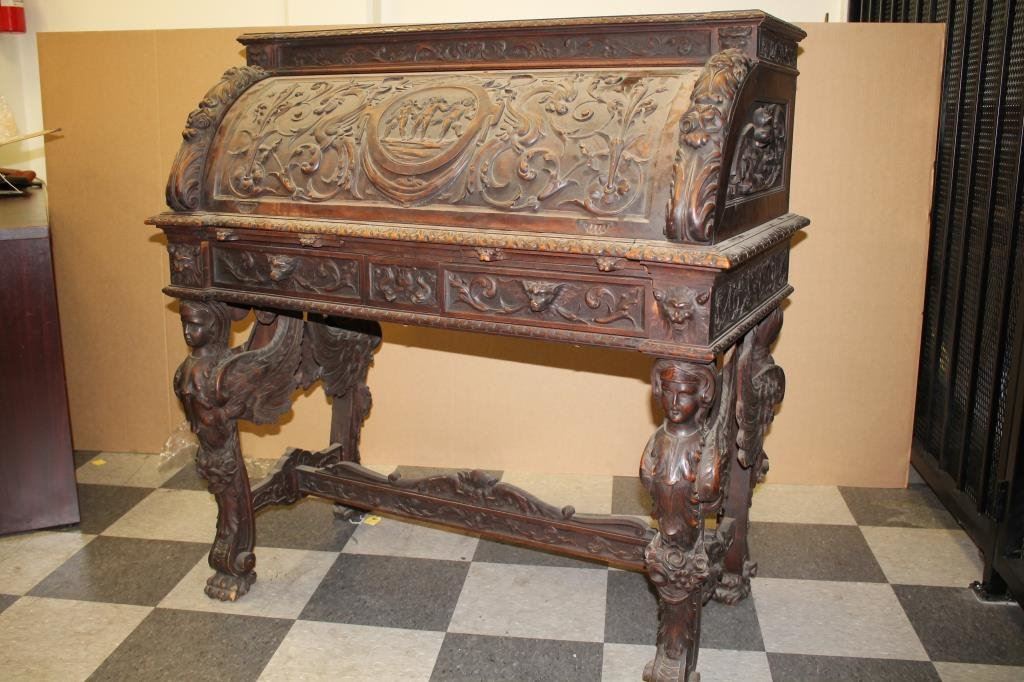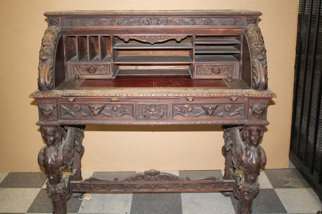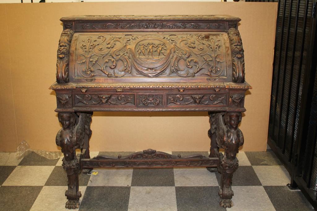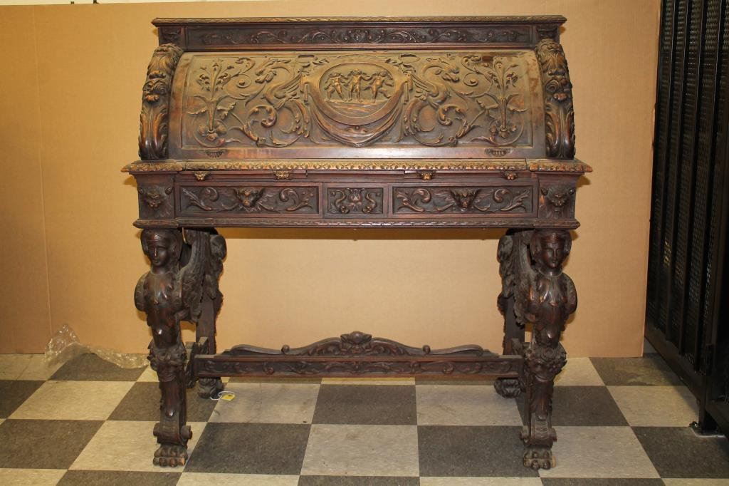 Magnificent carved desk; 18th to 19th Century; marked “Fox Studios”; sold by Auction Productions in the 1990’s when Bob Greene and Little John sold the props from the Carrington Mansion used in the T.V. series “Dynasty”. This very prop was probably in many “Golden Age” films; approximately 45” tall by 43.5” wide and 23.75” deep; needs restoration but carving is sharp. Est.: $2,000-$4,000.