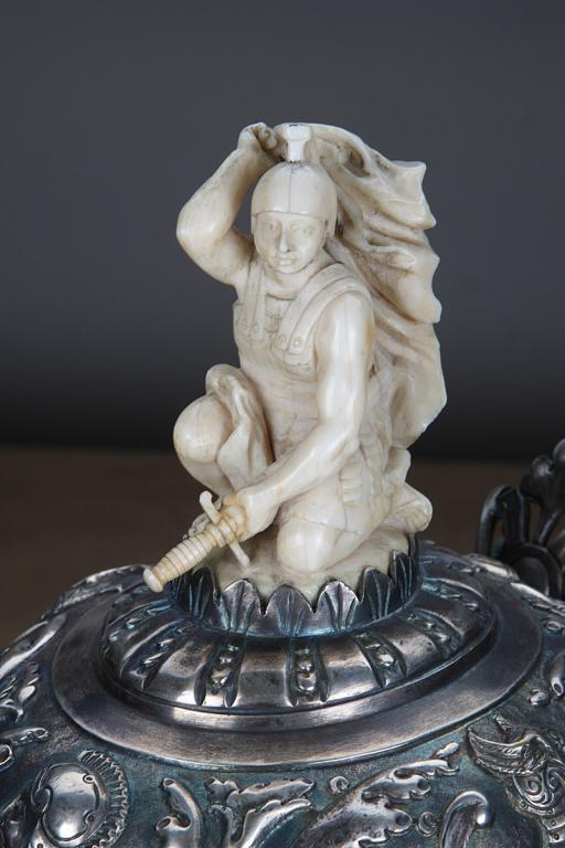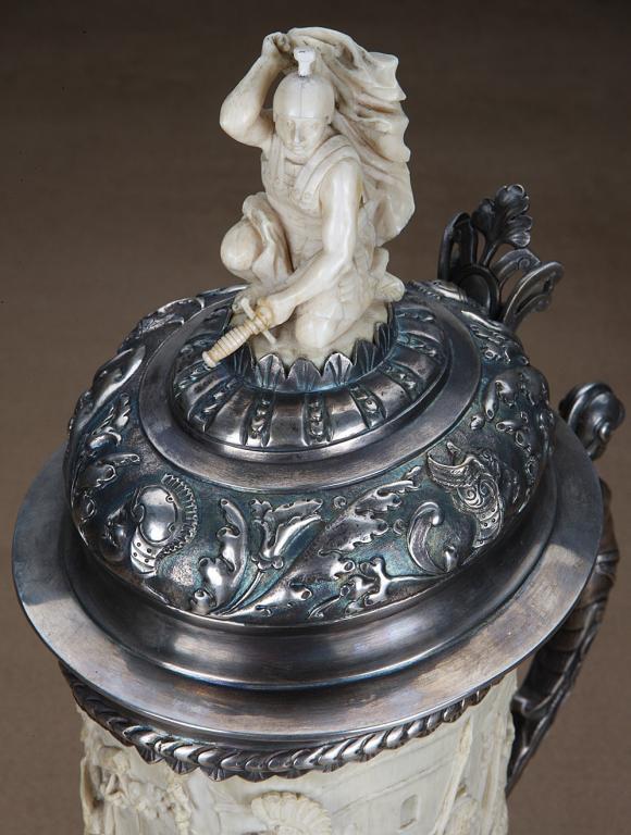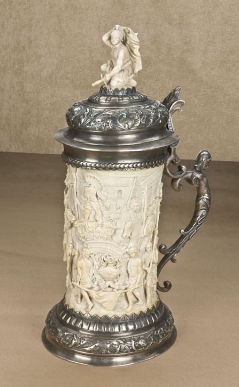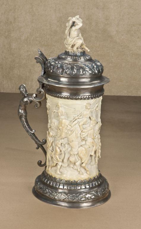 Magnificent carved ivory tankard in ancient battle scenes showing Hannibal with elephants, attendants, and horsemen in full battle armor as they travelled through the alps. The tankard measures 16” in height by7” across the widest part of the ornate silver plated over brass mounts which are ornamented in high relief in matching battle scenes. The tankard dates to the mid 19th century and is the finest carving imaginable. This particular tankard was in the personal collection of Robert Elz, well known antique arms dealer who collected ivory from the 1950’s through his passing in 1979. The tankard was then obtained by Ronald MacWillie of Lakewood, California, who was also an ivory and high art European arms collector. For a period of 30 years, Robert Elz, Ron MacWillie, and Martin Redding wrestled for ownership of this fine artwork. All threeagreed that the carving on the body portraying the men in armor and elephants was as fine as any they had ever seen. The condition is fine to excellent. There has been a small repair to the grip of the sword