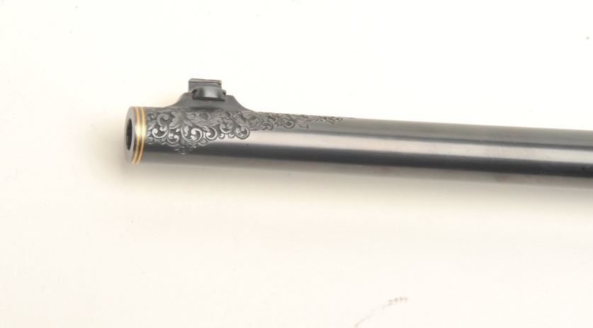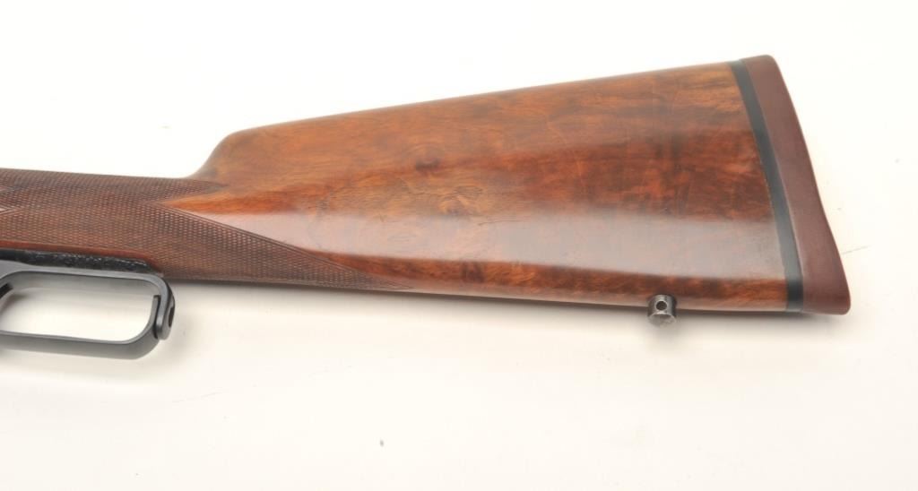 Magnificent engraved Winchester Model 95 lever action rifle, in exhibition style with African Hunting scenes, deep floral engraving and gold line borders; .35 W.C.F. caliber, 24” heavy round barrel, blued finish, deluxecheckered wood stocks with horn forend tip and Winchester hard rubber butt pad, S/N 425386, in overall excellent condition showing minimal handling. (Modern). Est.: $6,000-$12,000.