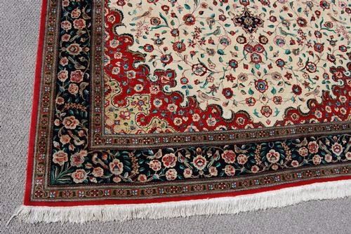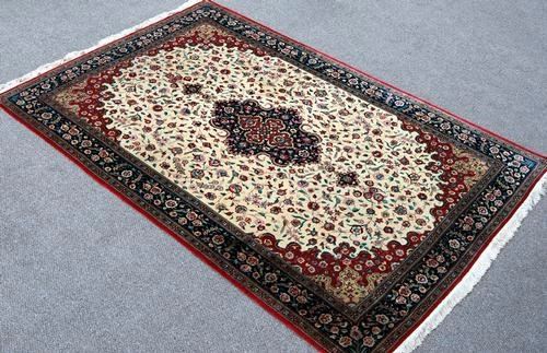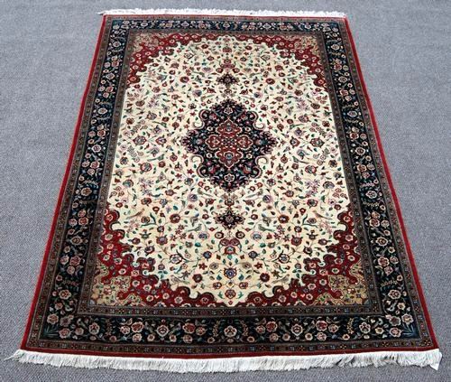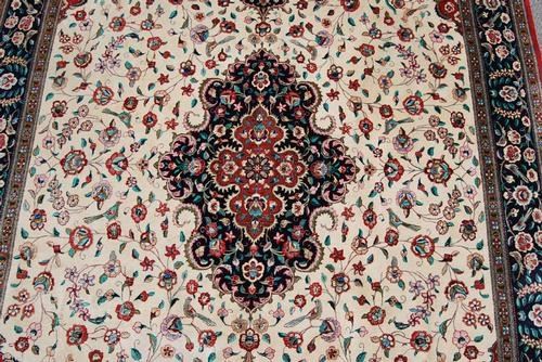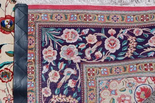 Iustrous super fine all pure silk pile and foundation Persian Qum Rug. Made of all natural, vegetable dye, hand woven, pure silk pile on silk foundation. This is a lovely and lustrous fine silk Qum with its stylized central medallion one light milky background. Qum is known as the birthplace of some of the finest silk Rugs of Iran. These fine pieces have not only the finest weave but also display a uniqueness in the broad range of designs and choices of colors. This is best understood and appreciated when one becomes aware of the fact that Qum lies at the edge of the desert, a harsh and barren type of environment. Qum Rugs therefore become the centerpiece and source of charm and pleasure in the household and the living quarters. Please notice the charming collection of birds and animals that adorn this lovely piece in both, the main field and the primary border. This piece is masterfully hand woven, knot by knot, by master weaver Qumi and has over 600 knots per square inch. It would take a master weaver over four years to bring this beauty to life. Size: 6 feet 6 inches X 9 feet 6 inches.