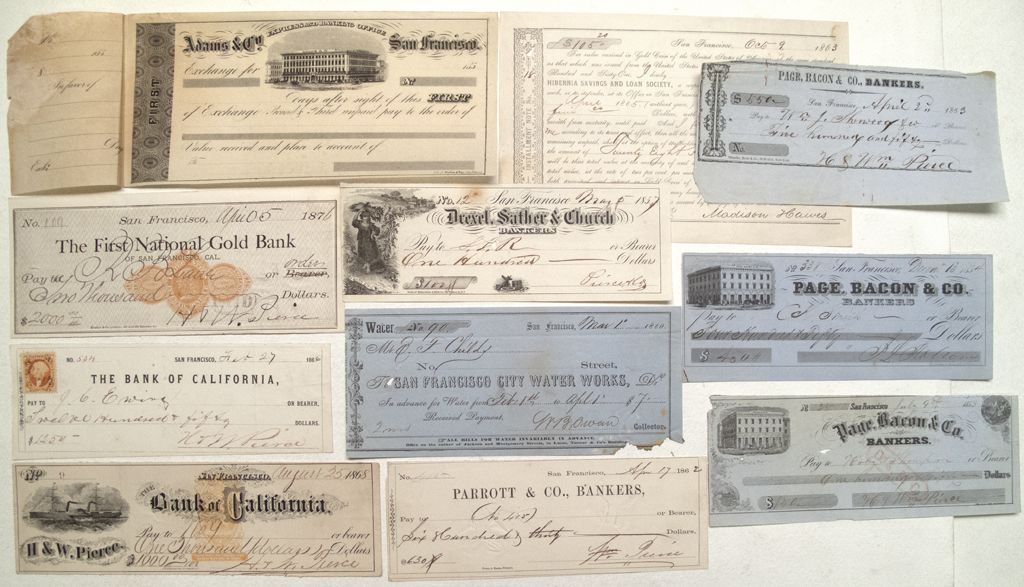 Lot of twelve. 1) 1850 VERY EARLY check from Dunbar's California Bank. 2) 185? First of Exchange from Adams & Company. 30-5) Three different Page, Bacon, & Co. checks. April 2, 1853 William Pierce to William J. Sherwood. July 9, 1853 William Pierce to Holey & Thompson. December 31, 1854 check for $450. 6) 1857 Drexel, Sather, & Church check from Prince & Co. 7) S. F. City Water Works to E. F. Childs. 1860. 8) 1862 Parrott & Co. Banker. 9) 1868 Bank of California with STEAMER VIGNETTE. 10) 1866 Bank of California check. 11) First National Gold Bank circa 1870's. 12) 1863 Madison Hawes loan.