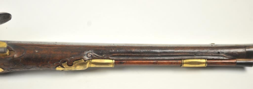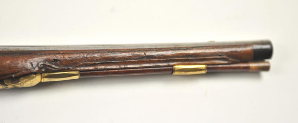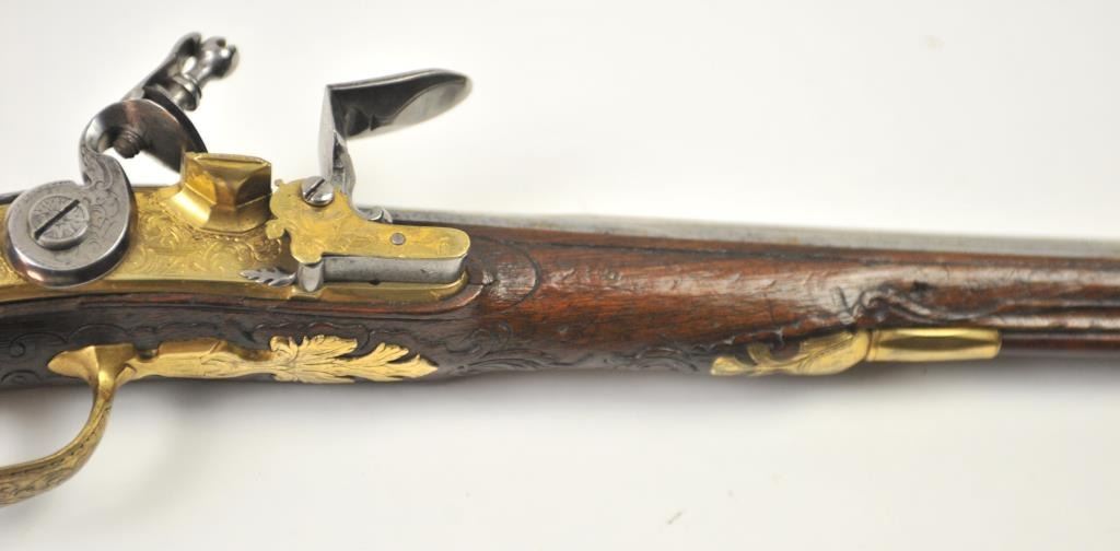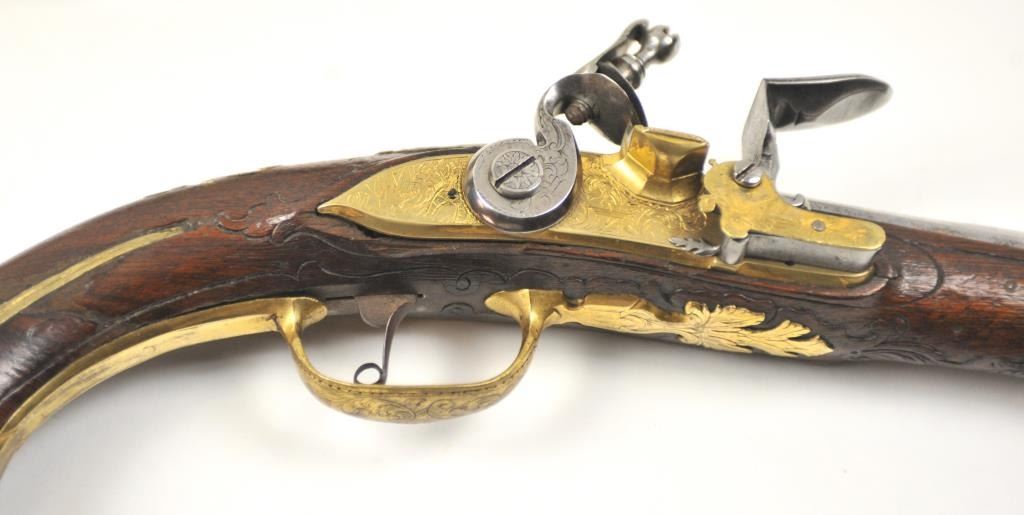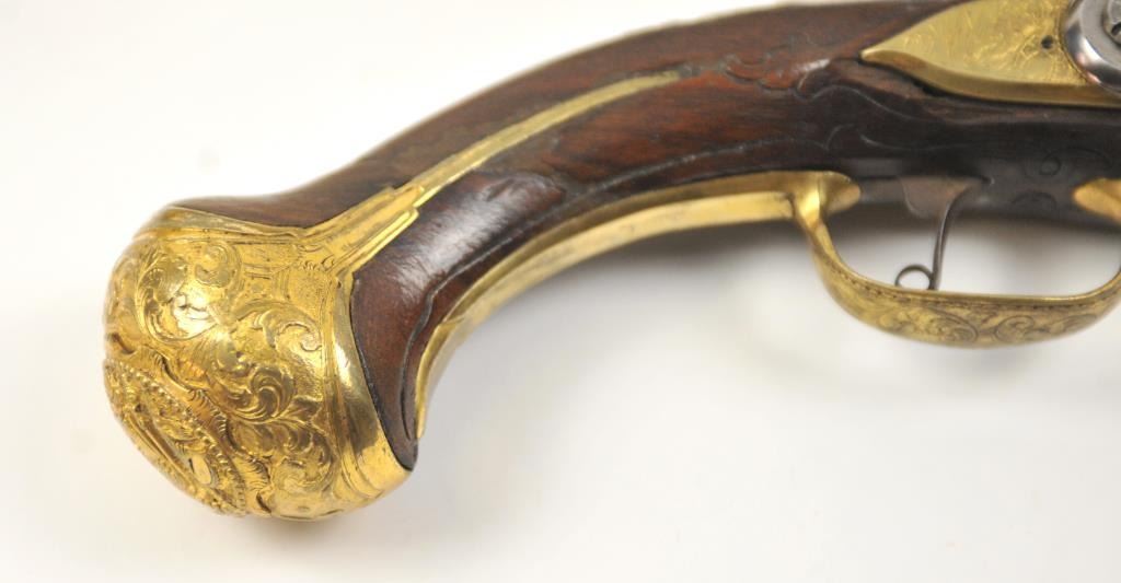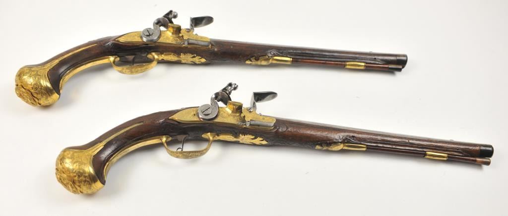 Magnificent pair of 18th century European royal quality flintlock horseman’s size pistols with richly gilt ornate cast brass mountings. The pair are of generous proportions measuring 22” in overall lengthwith 14 ¼” barrels of approximately .60 caliber smoothbore. The barrels are fully and finely engraved from tang to muzzle with significant traces of gold gilt around the stand of arms and floral engraving. Thelocks and mounts are also finely engraved in a similar motif along with an unusual frizzen spring cover or protector. The side plates are pierced as is the plaque inlaid in the wrist. The bulbous butts show raised reliefstands of arms. The hammers and frizzens are original and the pair are in their original flintlock configuration. The stocks show incised and raised carving. The origin, in our opinion, is Southern Germany or possiblyCarlsbadian and though not signed, are excellent quality and possibly made at a royal workshop. The condition is original fine to near excellent showing only a light cleaning with very good stocks showing a