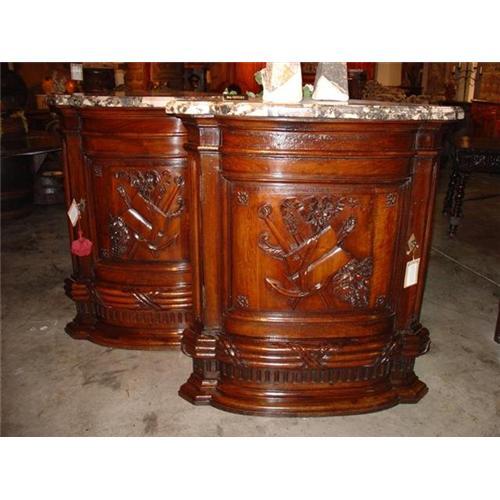You are looking at a beautiful pair of mid 18th Century walnut wood corner cabinets from France. They have their original marble and they are hand carved. The front of the doors have a nautical theme with mixed styling, including the Louis XVI ribbon/bow. Each door has been hand-honed from one single piece of Walnut tree. The sizing is slightly different on each corner cabinet because they were originally commissioned for a specific room. Also, there is an Ebenists mark on the left front of the larger cabinet.