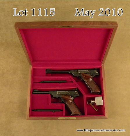 Magnificent pair of factory engraved and gold inlayed Colt Woodsman .22 caliber semiautomatic target pistols by master engraver Leonard Francolini. The set consists of a 6-1/2" Woodsman and a 4-1/2" Woodsman that were returned to thefactory in 1979 for factory embellishment by recognized collector Horace Greely IV. With factory letters confirming engraving and inlay, order number 890, also mentioning presentation Colt display case. The pair show a high polishroyal blue finish, which was applied at the time of embellishment. The pair are in excellent to mint condition. This exact pair are pictured on the cover of the Rampant Colt magazine, September 1991 issue and in other publications included.Leonard Francolini is considered one of the great masters of firearms engraving and his work is actively sought after by sophisticated collectors. Est: $8,000 - $16,000