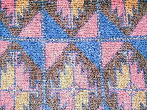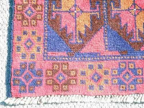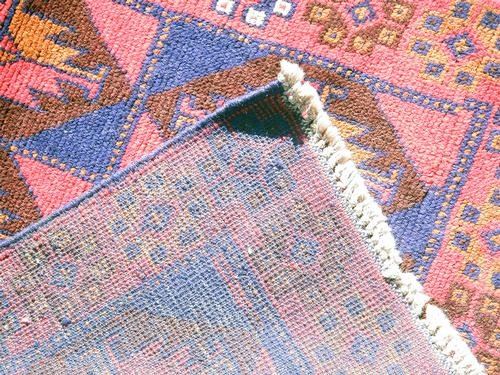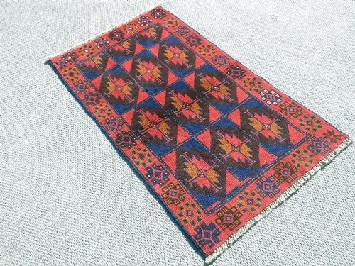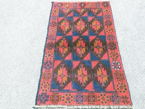 Magnificent semi-antique Persian. 100% natural, hands woven, vegetable dye, worsted wool pile on cotton foundation. the waver has incorporated an allover medallion in a geometric design on red and navy background. Hand woven in City of Baluchistan from Iran. Sizae: 2 feet 9 inches X 4 feet 3 inches.
