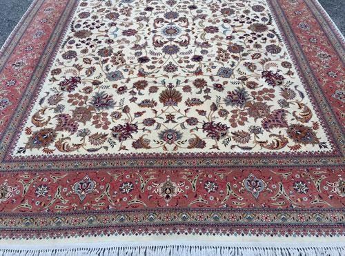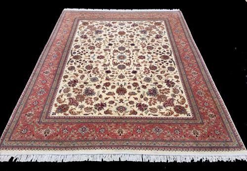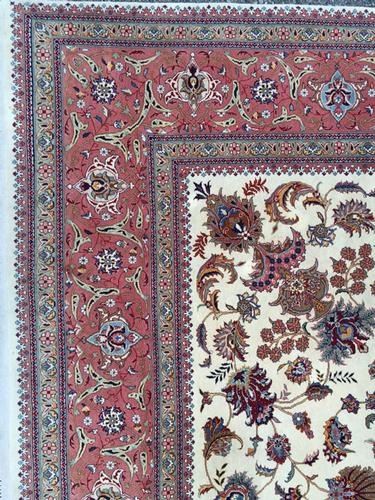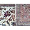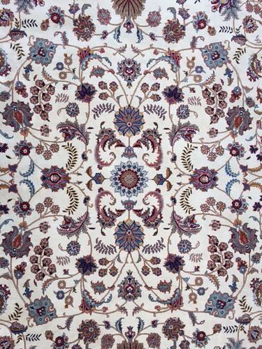 Darling, super fine magnificent Persian-Pak Isfahan rug. 100%natural, vegetable dye, hand woven, finest baby lamb's wool pile on cotton foundation. This breathtaking floral Isfahan design with an ornate arabesque pattern on a beige background is an uncommonly intriguing piece. Given the fact that rugs are product of desert like environment, it is rather rare to come across Isfahan with such predominant beige background. Primary colors are typically employed to absorb the harsh and intense sunlight in order to be soothing to the eyes. This darling floral piece with its beautiful under-stated central medallion and lovely crowned corners is a testimonial to the idea that rugs are indeed portable garden. this fine piece is masterfully and painstakingly woven, knot by knot and has about 160 knots per square inch. It takes over four years to create this beauty and present it to the market. Superior quality, uncompromising spirited workmanship and artistic excellence, make this, a remarkable piece. Condition is excellent. Size: 12 feet X 9 feet. Country of Origin: Pakistan.