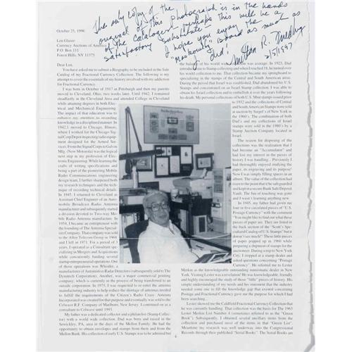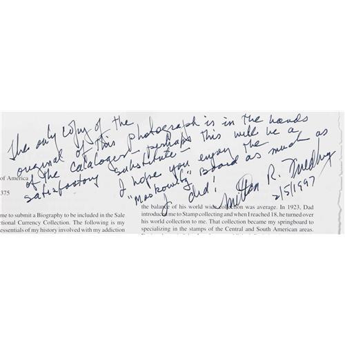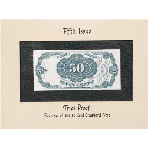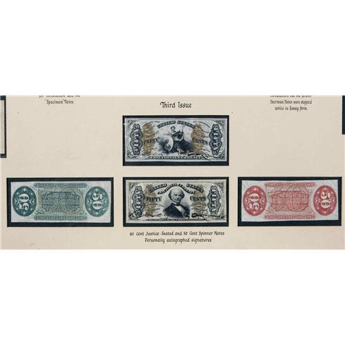 <B>Magnificently Mounted Fractional Specimen Collection.</B></I> We sold this item to its present owner as Lot 1200 from our January 1997 Milt Friedberg Collection. It was described there, "This outstandingly beautiful presentation board contains eleven Specimen notes: a 10¢ Third Issue hand-signed Colby Spinner Wide Margin Face along with its Red and Green Backs, a Narrow Margin Colby Spinner hand-signed Justice face and Spinner Face and their respective Red and Green Backs, and lastly, a very rare 50¢ Fifth Issue Back on India paper, this final, very rare Specimen appearing through the mounting to be a Gem. Its margins are fuller than one would expect, and the paper seems absolutely perfect. The presentation board itself is done in red, gold and black calligraphy. Formerly from the Moskowitz Collection, Milt retained this magnificent item in its original form. Most all other Moskowitz boards have been broken apart and the items scattered about the market place. We hope this wonderful display piece remains together." When we sold Milt's Collection, this board appeared hanging above Milt's desk in the photo that appeared with his biography on page 4 of our catalog. The subsequent purchaser, who is now our consignor, corresponded with Milt about the item and received a signed copy of that page with the following quote, "I hope you enjoy the 'Moskowitz' board as much as I did!" Signed and dated by Milt February 5, 1997. That signed page is included with the lot. It is now time to pass this great Fractional Collectible on to a new owner.
