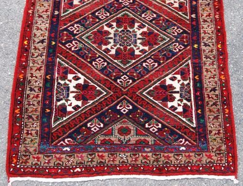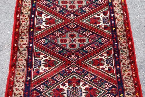 Magnificently vibrant 11' Persian Karajeh runner. Made of fine quality lamb's wool pile on cotton foundation, all natural vegetable dye, incorporating a finely detailed sequence of patterns on a cream colored background that are both floral and geometric, center row of large medallions and finished off beautifully with an intricately done floral border. Hand woven in Karajeh, Iran. Size 10.5 x 3.10 feet.