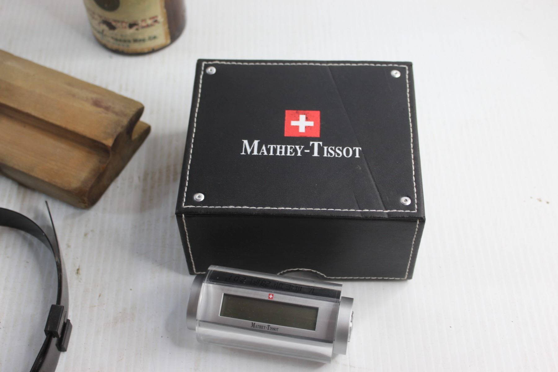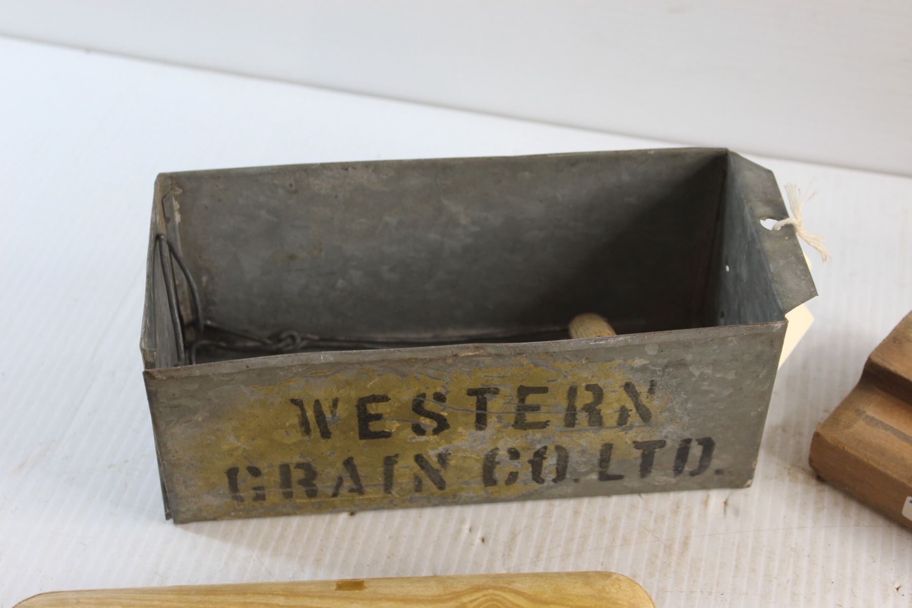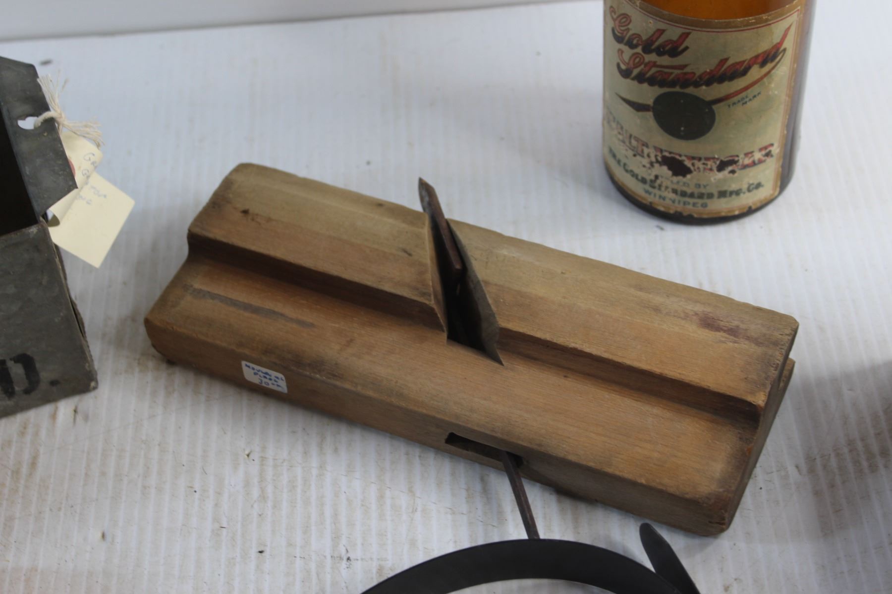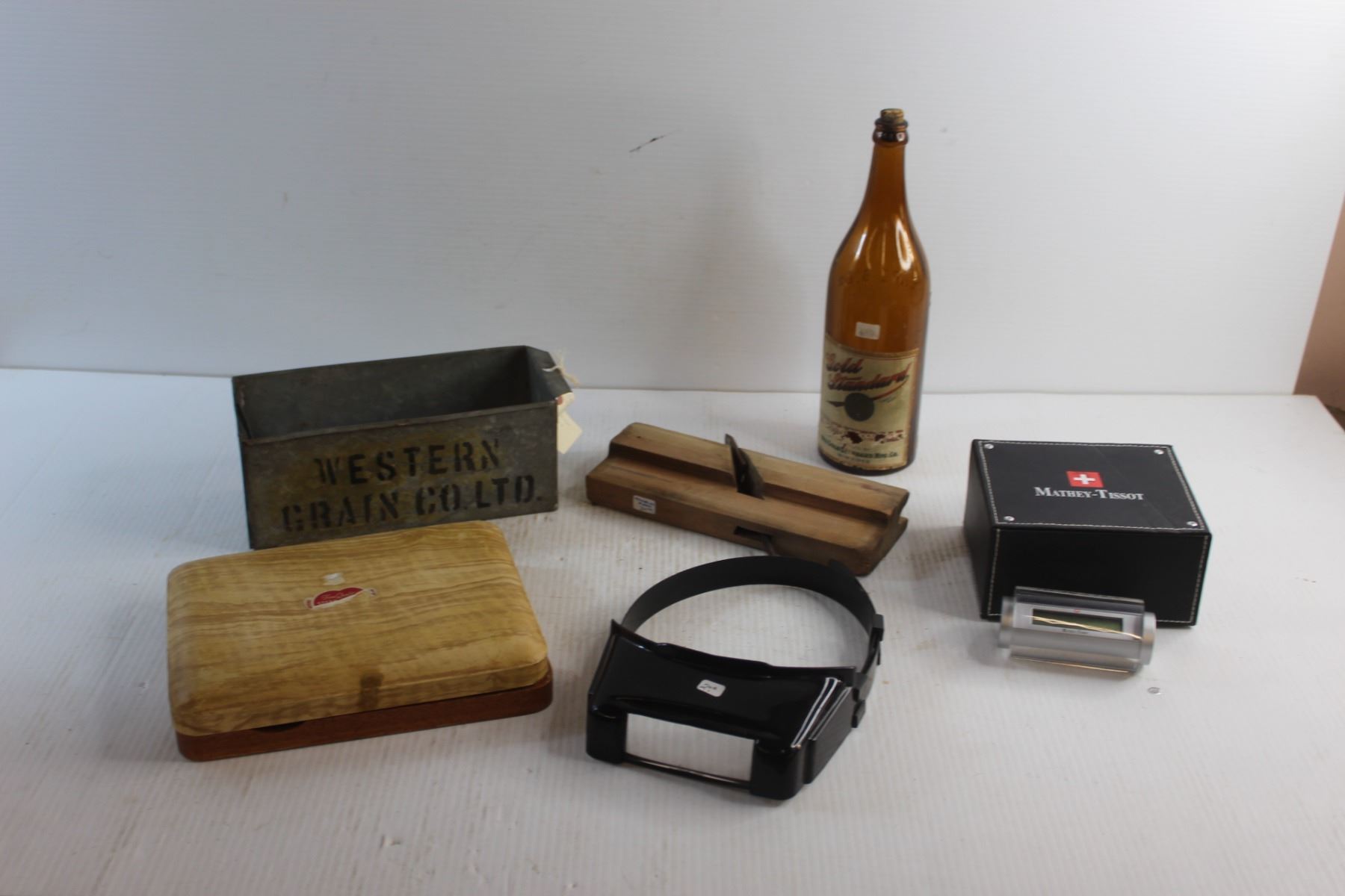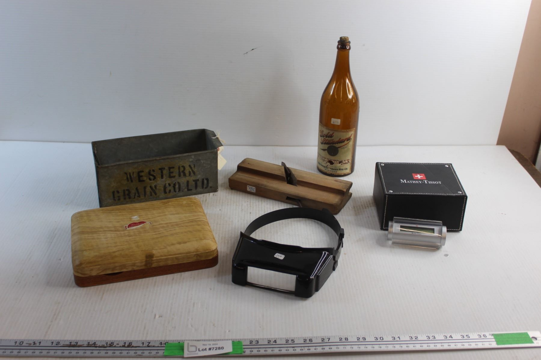 Magnifying Glasses, Moulding Plane, Mathey Tissot Clock Alarm - As Is, Grain Elevator and Vintage Glass Bottler