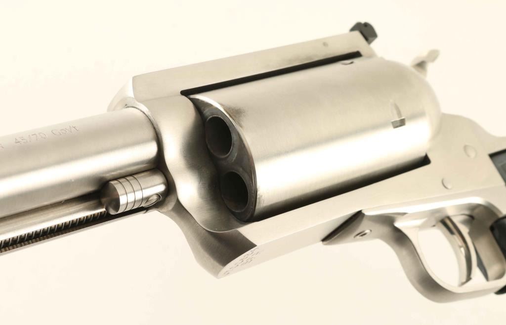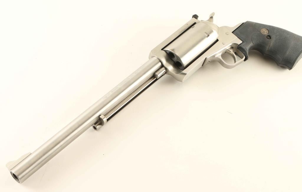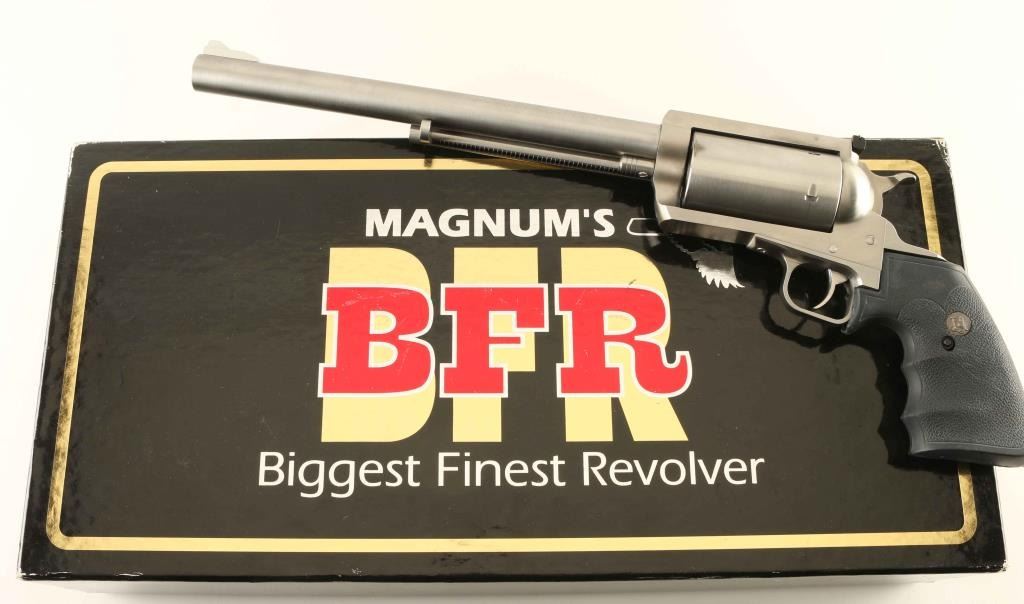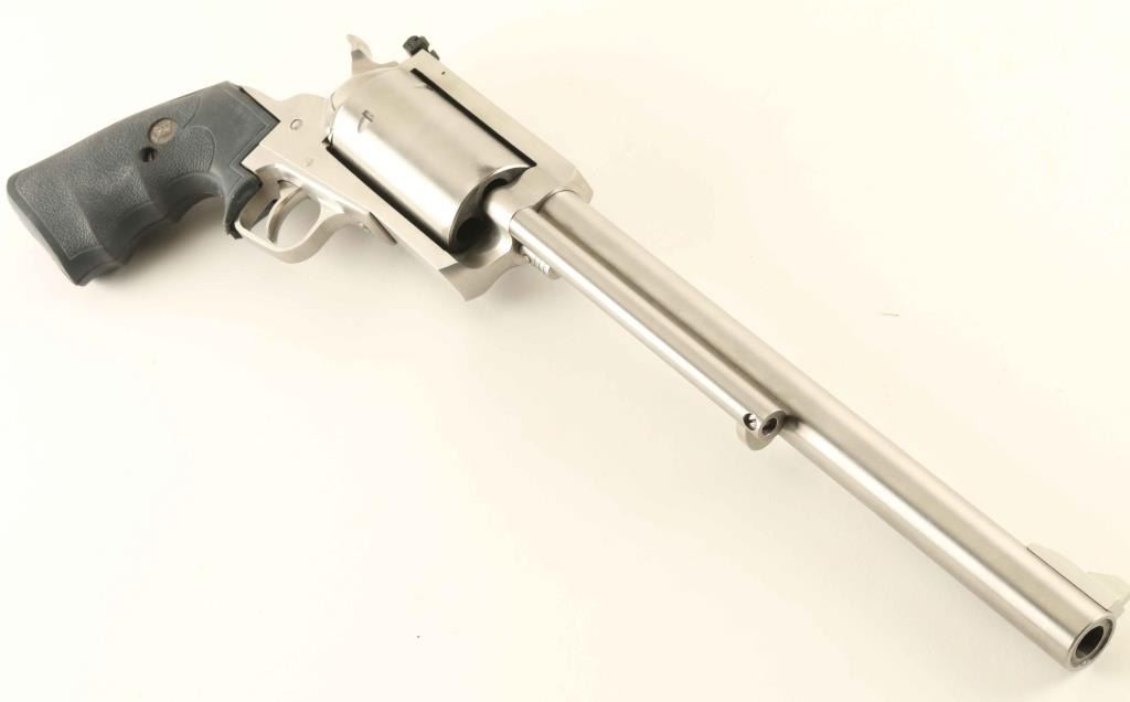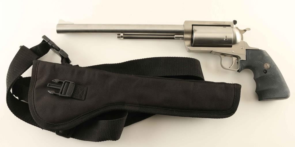 'Biggest Finest Revolver' Extra large frame stainless steel single action revolver chambered in .45-70 Government, manufactured circa 2001. Features a satin stainless finish, 10" barrel, raised ramp front sight with orange accent, adjustable rear sight, smooth trigger, serrated wide hammer spur, unfluted five-shot cylinder, ejector rod, and one-piece Pachmayr Gripper textured rubber finger groove grip. Includes the original factory cardboard box with documents, lock, spent case, original grip and a black nylon holster. Revolver exhibits only light handling marks and a thin drag line on the cylinder. Action is smooth with very good lock-up, the bore appears excellent but dirty and the rubber grip is fine. Condition is NRA Excellent in box. ***Modern Firearm***
