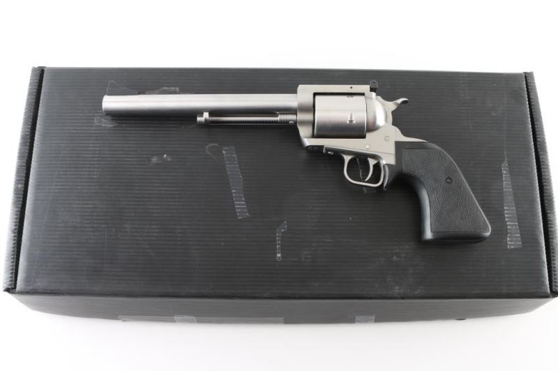 SN: JT11913 'Big Frame Revolver' Extra large frame stainless steel single action revolver. Features a brushed finish, 8" barrel, raised blade front, adjustable rear sight, smooth trigger, serrated wide hammer spur, transfer bar safety, non-fluted five shot cylinder, ejector rod, and two-piece Uncle Mike's checkered black rubber wrap-around grips. Bore is excellent. Revolver is near new condition with few minor handling marks. Action is smooth with tight lock-up. Includes factory box with paperwork, Weaver type scope base for mounting to topstrap. Condition is NRA Excellent - like new ***Modern Firearm***